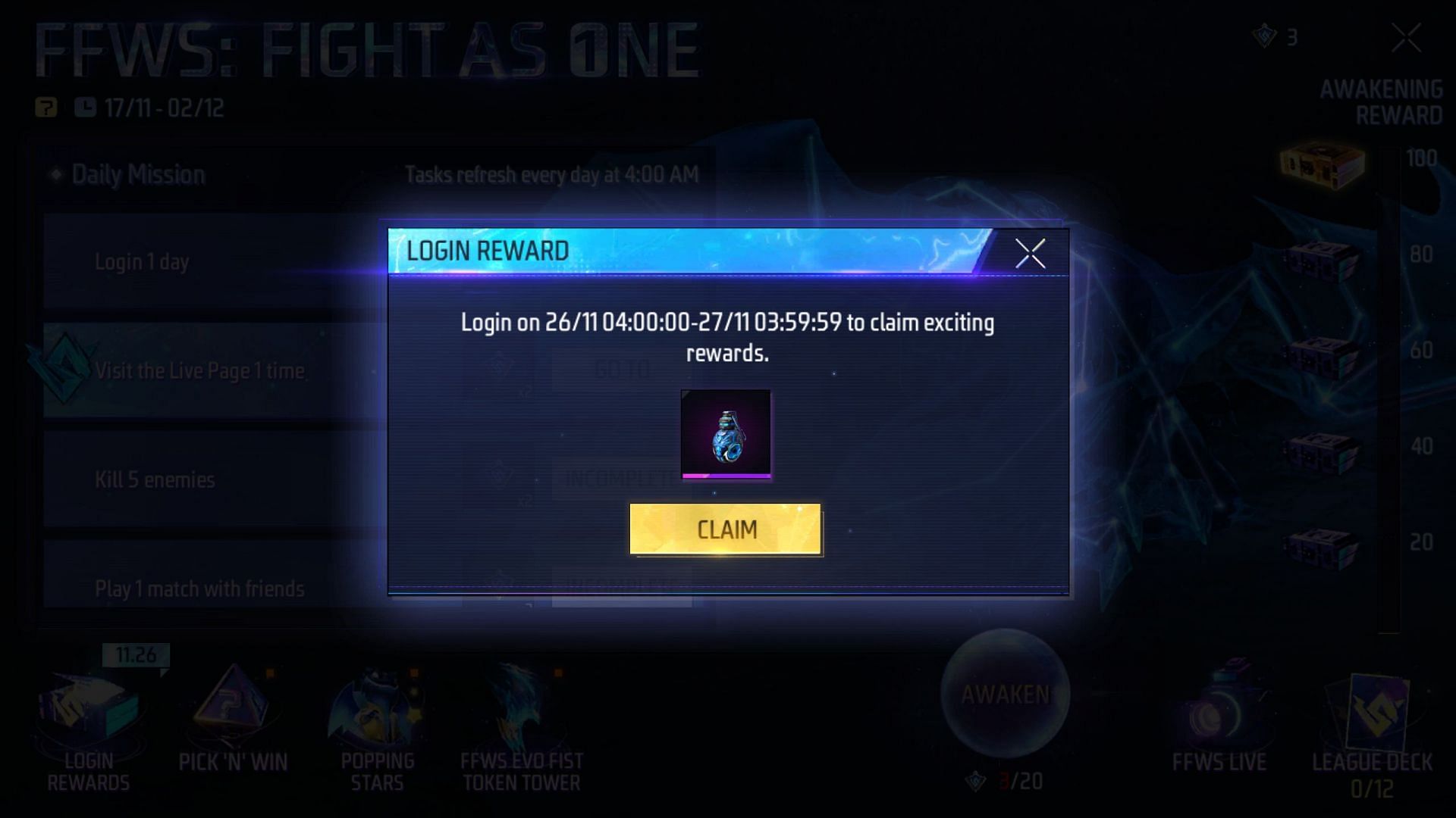 Free Fire MAX को 26 नवंबर 2022 में शुभ 4 बजे से लेकर 27 नवंबर 2022 की सुबह 4 बजे के बीच लॉगिन करें। आपको खुद लॉगिन करके इनाम को कलेक्ट करना होगा। यह चीज़ एकदम मुफ्त है और आपको इन स्टेप्स का पालन करके इवेंट में हिस्सा लेना होगा: