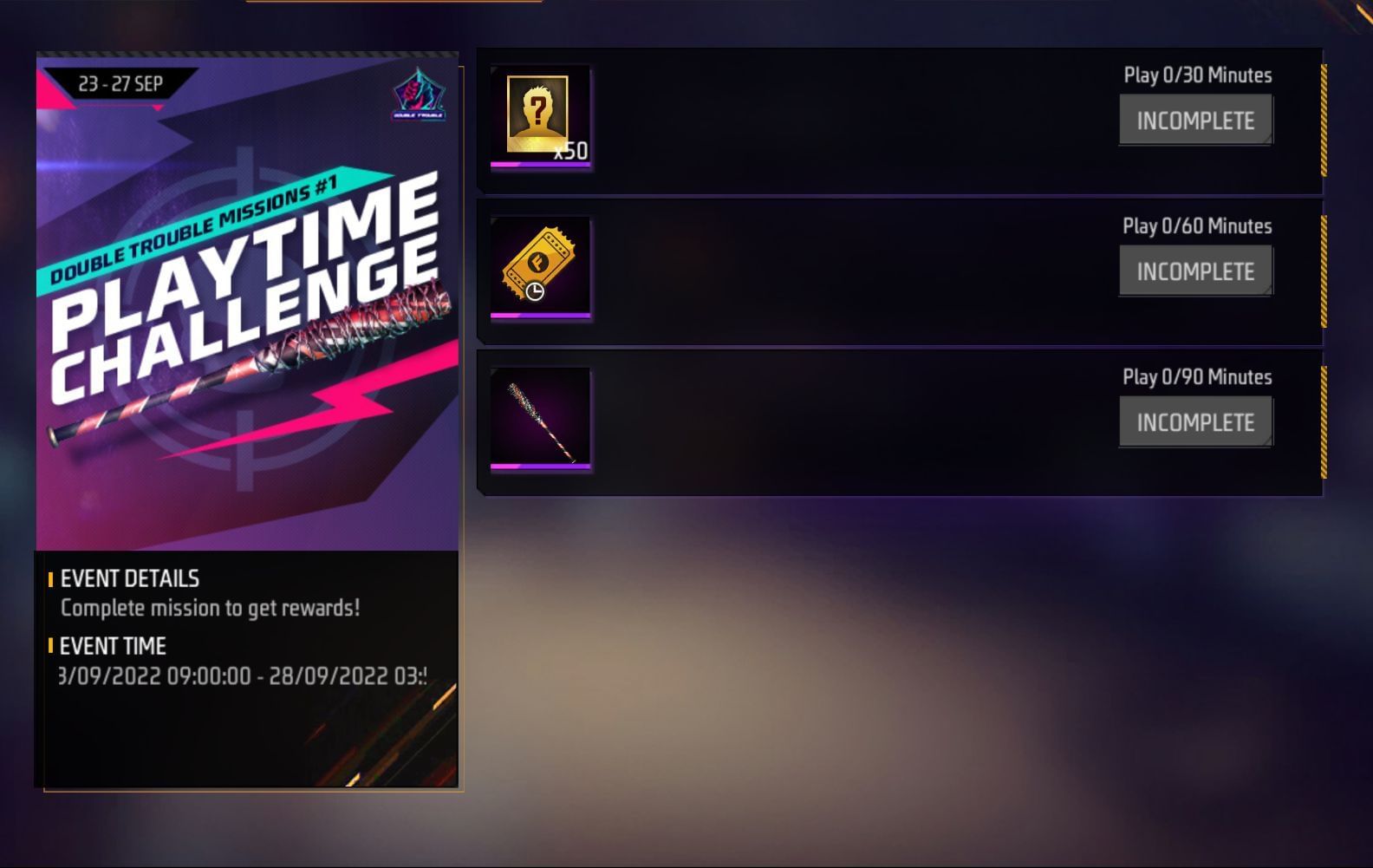 नया Playtime Challenge इवेंट असल में Free Fire MAX के भारत सर्वर पर आज यानी 23 सितंबर 2022 को लाया गया है। इसमें तीन शानदार इनाम हैं और आप इन्हें 27 सितंबर 2022 तक हासिल कर सकते हैं।