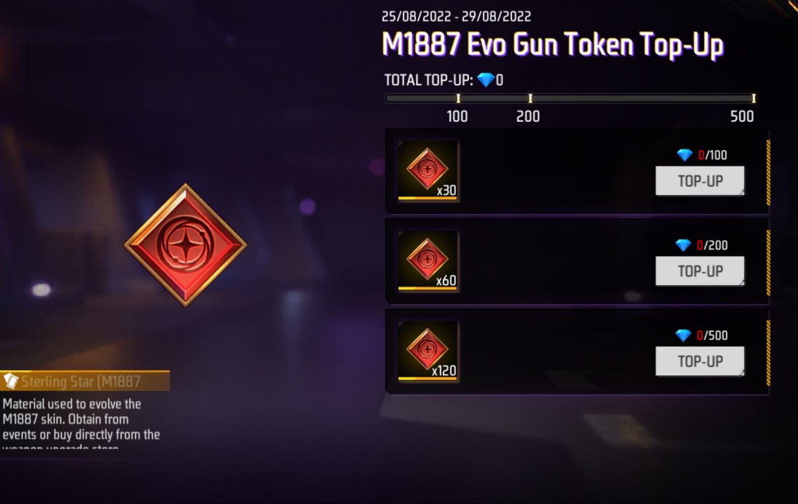 प्लेयर्स डायरेक्ट 500 डायमंड्स का टॉप-अप करके तीन आइटमों को प्राप्त कर सकते हैं। प्रत्येक आइटम में Sterling Star (M1887) गन मिलेंगी।