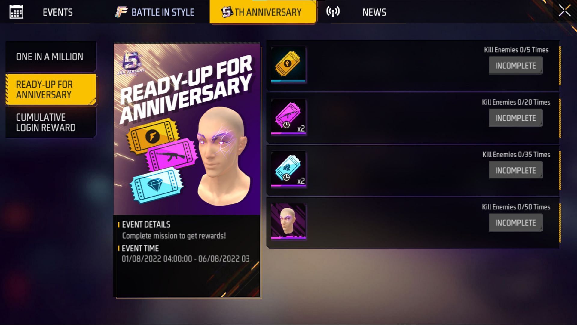 Free Fire की 5वीं सालगिरह पर Ready-Up For Anniversary इवेंट को जोड़ा गया है और इसका अंत 5 अगस्त 2022 को वाला है। इसमें आप यह चीज़ें पा सकते हैं: