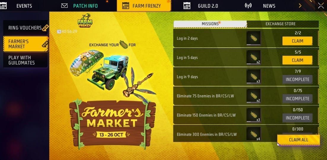 Free Fire MAX में Farm Frenzy कैलेंडर चल रहा है। डेवलपर्स के द्वारा भारतीय सर्वर पर Farmer's Market इवेंट को 13 अक्टूबर 2023 को जोड़ा गया था। यह इवेंट 26 अक्टूबर 2023 तक चलेगा। इस इवेंट में हिस्सा लेकर मिशन्स को पूरे कर सकते हैं और मुफ्त में Corn टोकन्स को क्लेम कर सकते हैं। इन टोकन्स का उपयोग एक्सचेंज स्टोर में जाकर आयटम्स को रिडीम करने के लिए कर सकते हैं। यहां पर मिशन्स की जानकारी दी गई है: