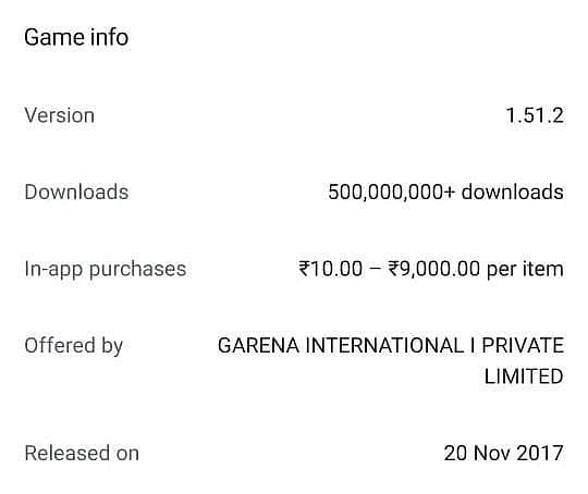 Free Fire को Google Play Store पर 500+ मिलियन्स लोगों द्वारा डाउनलोड किया गया है। एनी की रिपोर्ट के अनुसार पिछले साल यह गेम सबसे ज्यादा डाउनलोड्स किये जाने वाले चार्ट में सबसे उपर स्थान पर मौजूद था।