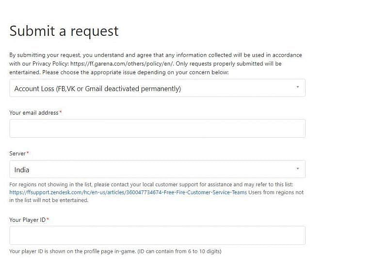 यहां से खिलाड़ी खोए हुए FreeFire एकाउंट के बारे में रिक्वेस्ट सबमिट कर सकता है। यहां पर खिलाड़ी को कुछ जानकारी भरनी पड़ेगी।