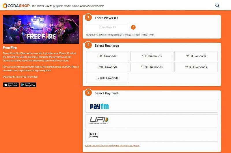 Free Fire में डायमंड्स टॉप-अप करने के लिए कोडशॉप सबसे फेमस वेबसाइट है। यह वेबसाइट खिलाड़ी को अच्छे और सस्ते टॉप-अप प्रदान करती है साथ ही डायमंड्स का टॉप-अप करने के लिए निचे दी गई स्टेप्स का पालन करें:
