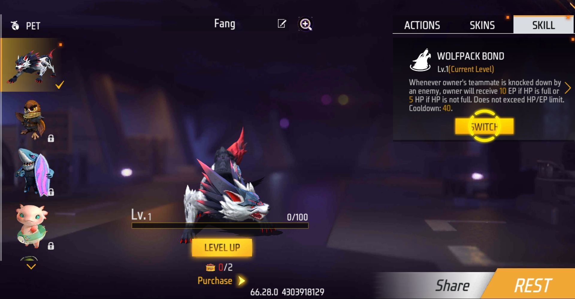 Free Fire के एडवांस सर्वर में Fang नाम का कैरेक्टर आया है। इस कैरेक्टर के पास Wolfpack Bond नाम की ताकत है। इस कैरेक्टर की ताकत से आप 10 EP हासिल कर सकते हैं, अगर आपके पास फुल HP हो। अगर HP कम हो तो फजिर आप EP की जगह HP मिलती है।