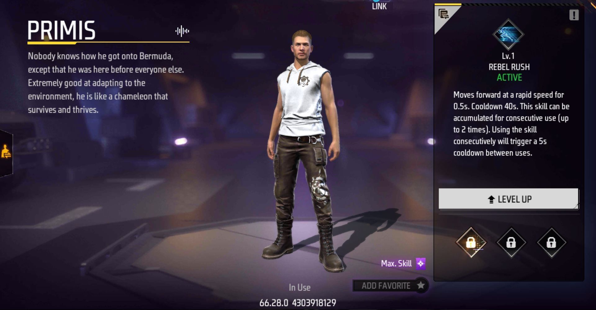 Free Fire MAX के OB36 एडवांस सर्वर में एक मिस्ट्री कैरेक्टर है और इसमें पास Rebel Rush नाम की ताकत है। इसकी मदद से आप तेजी से आगे बढ़ सकते हैं और इसका कूलडाउन 40 सेकंड्स का है।
