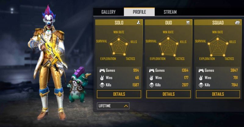 इसके अलावा उन्होंने लगभग 1000 सोलो गेम्स खेले हैं और उन्हें 46 में जीत मिली है। साथ ही उन्होंने 1587 किल्स किये हैं और उनका K/D रेश्यो 1.67 का रहा है।