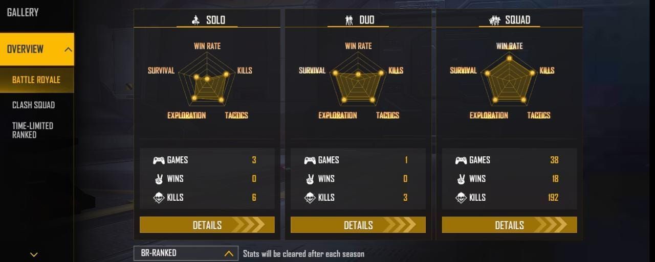 Munna bhai gaming ने गरेना फ्री फायर मैक्स में क्लैश स्क्वाड मोड के अंदर 38 स्क्वाड मैच खेले हैं और उन्हें 18 में जीत मिली हैं। इस दौरान उन्होंने 192 किल्स किये हैं और उनका K/D 9.60 रेश्यो का है। इसके साथ ही उन्होंने डुओ मोड में 1 मैच खेलकर 3 किल्स कर चुके हैं और उनका K/D 3.00 का है। उन्होंने सोलो मोड में 3 मैच खेलकर 6 किल्स किये हैं और उनका K/D रेश्यो 2.00 का है।