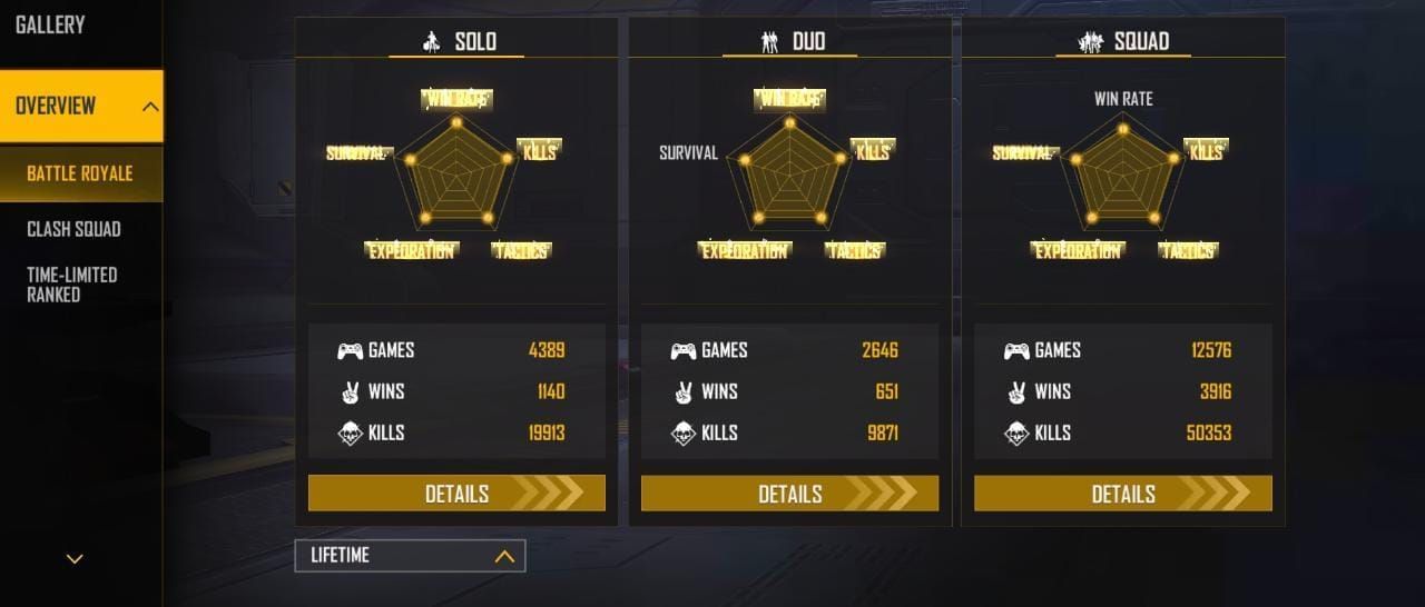 Munna bhai gaming ने गरेना फ्री फायर मैक्स में 12576 स्क्वाड मैच खेले हैं और उन्हें 3916 में जीत मिली हैं। इस दौरान उन्होंने 50353 किल्स किये हैं और उनका K/D 5.81रेश्यो का है। इसके साथ ही उन्होंने डुओ मोड में 2646 मैच खेले हैं और उन्हें 651 में जीत मिली हैं। इसके साथ ही 9871 किल्स कर चुके हैं और उनका K/D 4.95 का है। उन्होंने सोलो मोड में 4389 मैचों में से 1140 जीत दर्ज की हुई है। इसके साथ ही उनका K/D 6.13 रेश्यो का है जबकि वो 19913 किल्स कर चुके हैं।