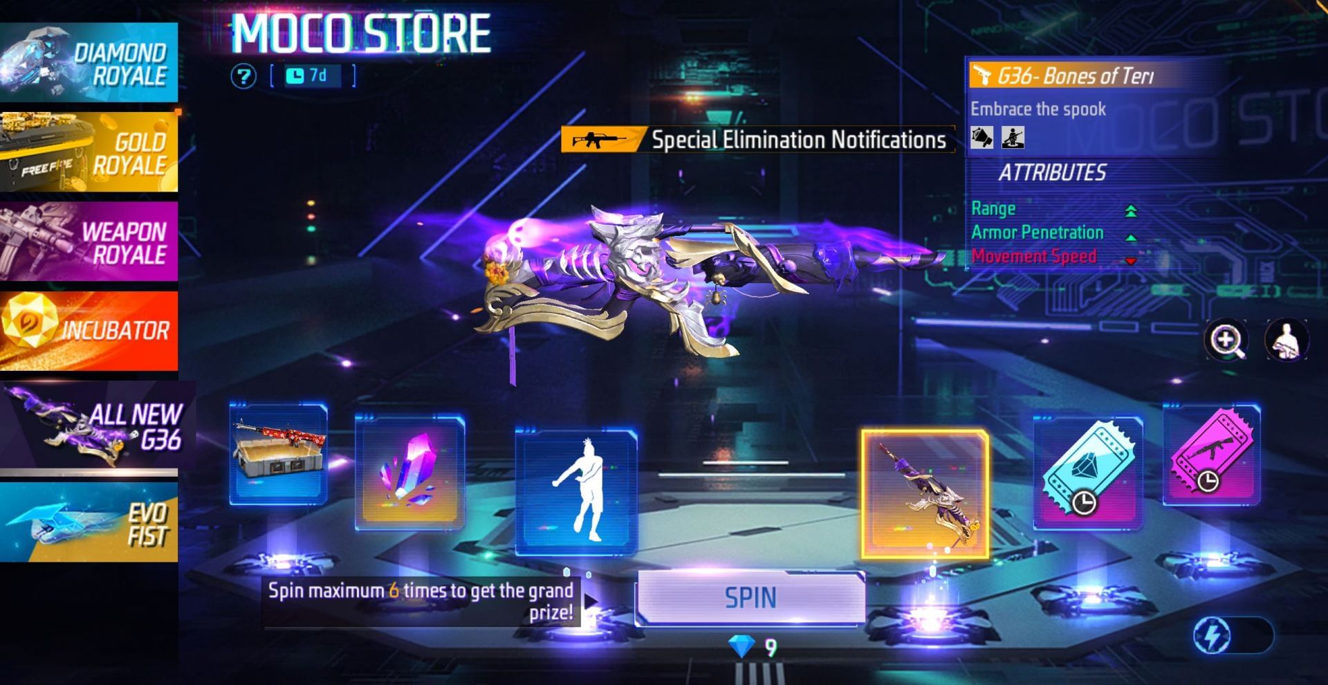 इस मोको स्टोर में स्पिन करने की शुरुआत 9 डायमंड्स से होंगी और करीबन 499 डायमंड्स तक जा सकती है। इवेंट में मौजूद नियम के अनुसार स्पिन करने की सीरीज कुछ इस तरह हो सकती है।