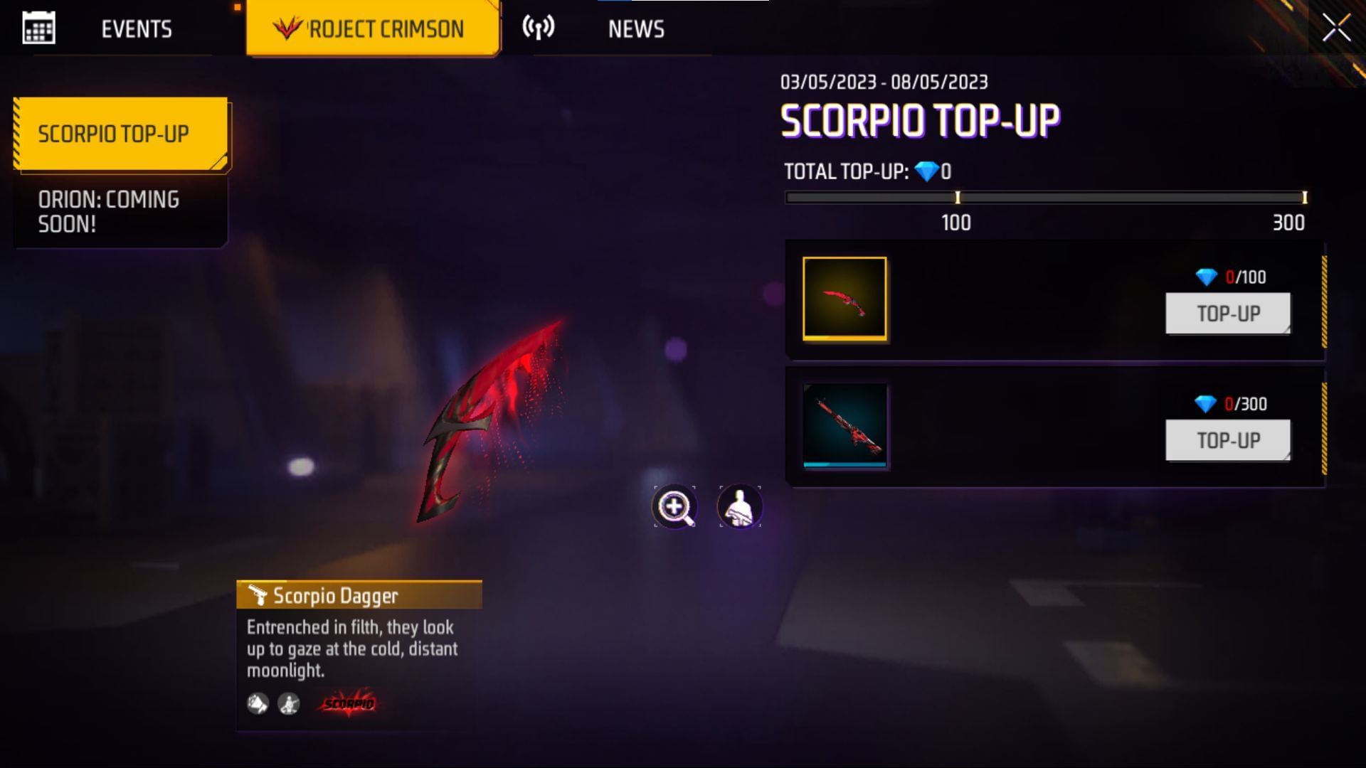 - 100 डायमंड्स का टॉप-अप करके मुफ्त में Scorpio Dagger ले