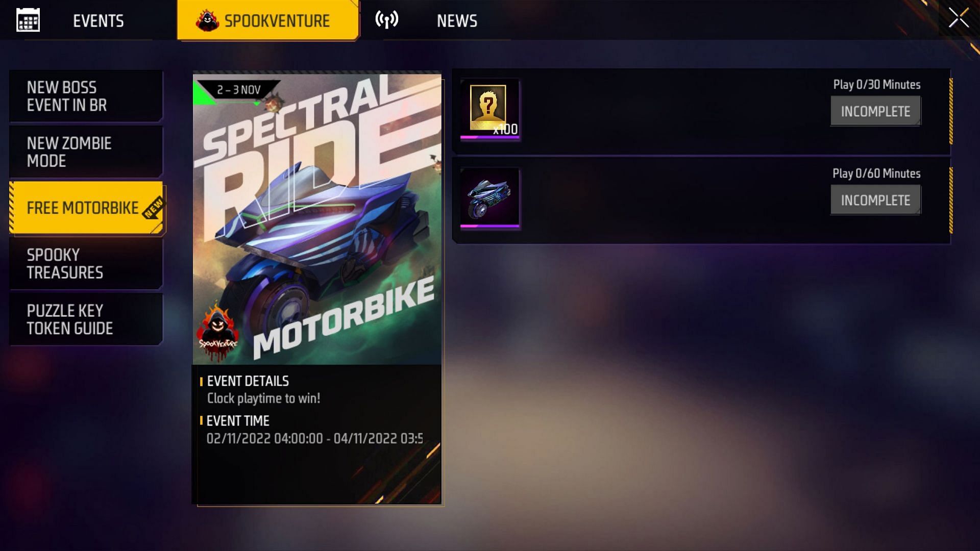 वर्तमान में डेवेलपर ने खिलाड़ियों को इवेंट प्रदान किया है जिसमें मुफ्त 100x यूनिवर्सल फ्रेग्मेंट और Motorbike Spectral Ride स्किन मिल रही है। गेमर्स इन दोनों इनाम को मिशन पुरे करके प्राप्त कर सकते हैं। ये इवेंट गेम के अंदर 02 नवंबर 2022 को जोड़ा था और 03 नवंबर 2022 तक रनिंग पर रहने वाला है। इस आर्टिकल में हम Free Fire Max में मुफ्त Spectral Ride Motorbike कैसे हासिल करें?, बताने वाले हैं।