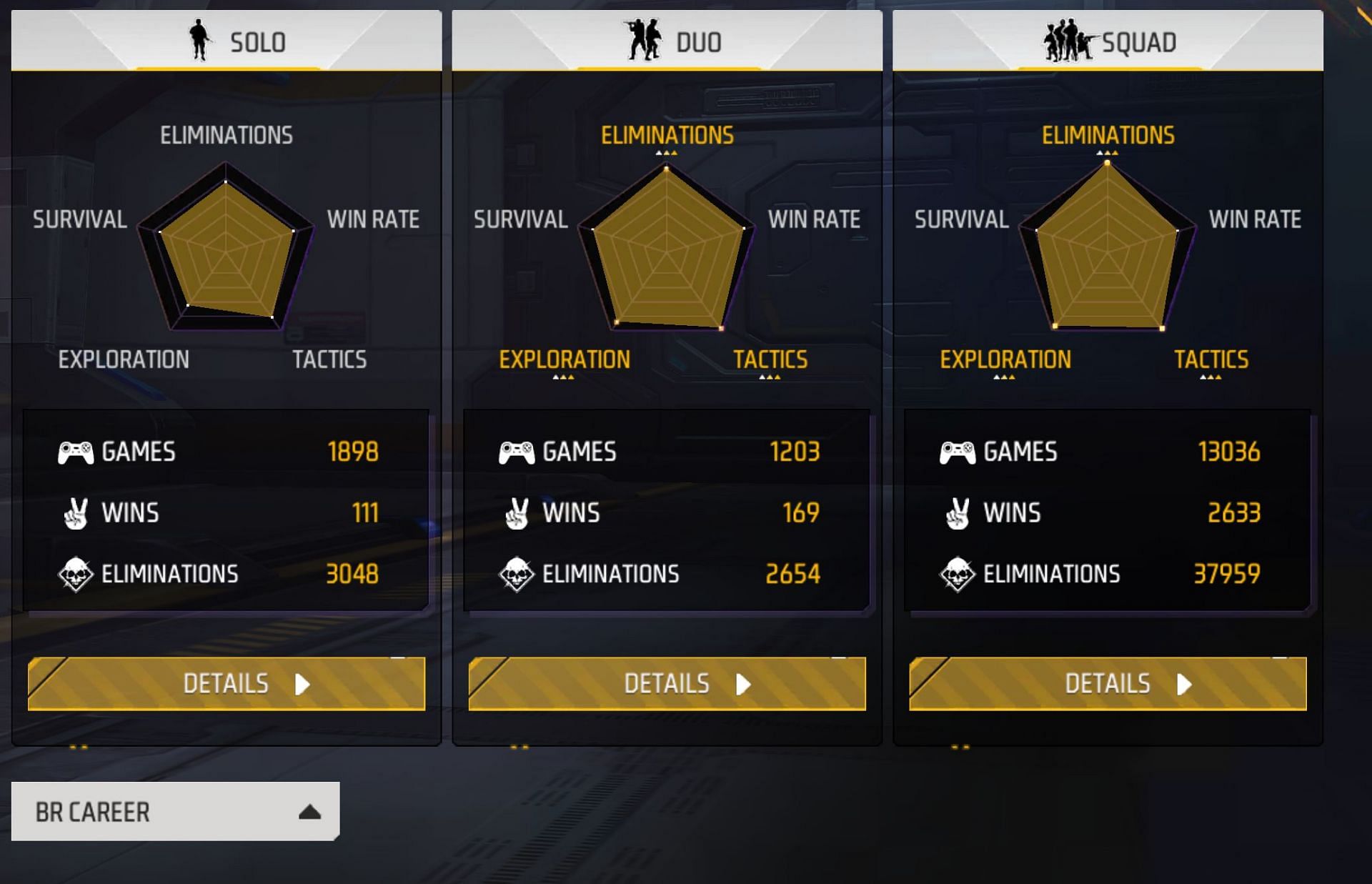 Nonstop Gaming ने फ्री फायर मैक्स में 13036 स्क्वाड मैच खेले हैं और उन्हें 2633 जीत मिली हैं। इस दौरान 37959 किल्स किये हैं और उनका K/D रेश्यो 1.71 का है। इसके साथ ही उन्होंने डुओ मोड में 1203 मैच खेले हैं और 169 में जीत हासिल की है। उन्होंने 2654 किल्स कर चुके हैं और उनका K/D रेश्यो 2.57 का है। इस खिलाड़ी ने सोलो मोड में 1898 मैच खेले हैं और 111 में जीत हासिल की है। उन्होंने कुल 3048 किल्स किये हैं और उनका K/D रेश्यो 4.38 का है।