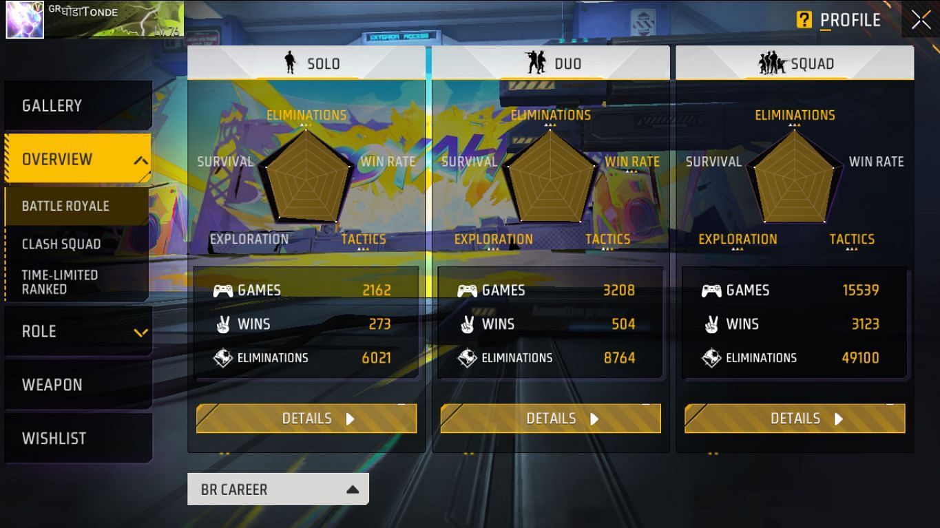 TGR NRZ ने स्क्वाड मोड में 15539 मैच खेले हैं और वो 3123 जीत प्राप्त कर चुके हैं। उन्होंने 49100 एलिमिनेशन किए हैं और उनका K/D रेश्यो 3.95 का है। उन्होंने 3208 डुओ मैचों में से 504 जीत दर्ज करने में सफल हुए। हैं वो 8764 किल कर चुके हैं और उनका K/D रेश्यो 3.24 का है। TGR NRZ ने 2162 सोलो मैचों में से 273 जीत चुके हैं। उन्होंने 6021 एलिमिनेशन कर चुके हैं और उनका K/D रेश्यो 3.19 का है।