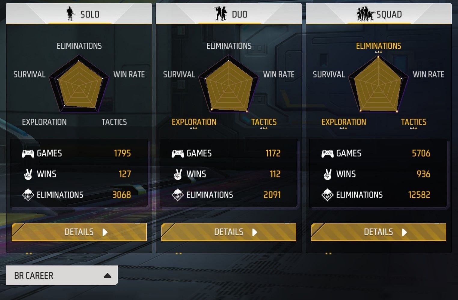 OP Gameplay ने फ्री फायर मैक्स में 5706 स्क्वाड मैच खेलकर 936 में जीत हासिल की है। उन्होंने 12582 किल्स किये हैं और उनका K/D रेश्यो 2.64 का है। उनका जीत प्रतिशत 16.40% है। इस खिलाड़ी ने डुओ मोड में 1172 मैच खेले हैं। इस दौरान उन्होंने 112 में जीत हासिल की है। उन्होंने 2091 किल्स किये हैं और उनका K/D रेश्यो 1.97 का है। उनका जीत प्रतिशत 9.55% है। उन्होंने सोलो मोड में 1795 मैच खेलकर 127 में जीत हासिल की है। इसके अलावा 3068 किल्स किये हैं और उनका K/D रेश्यो 1.84 का है। उनका जीत प्रतिशत 7.07% है।