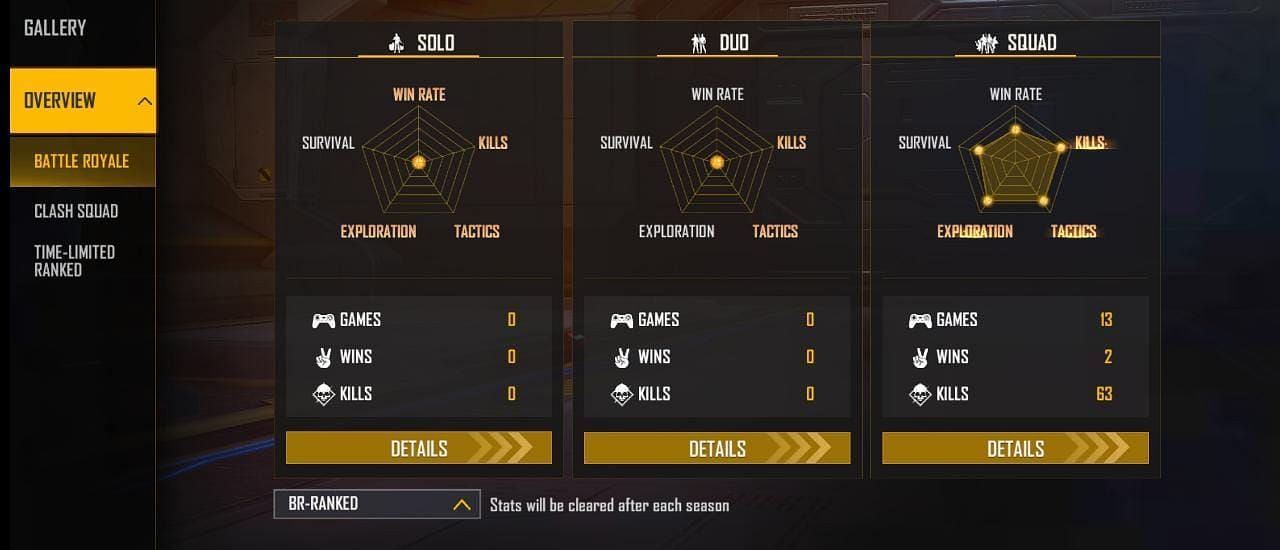 Pahadi Gamer ने फ्री फायर मैक्स में क्लैश स्क्वाड रैंक मोड के अंदर13 स्क्वाड मैच खेले हैं और उन्हें 2 में जीत मिली हैं। इस दौरान उन्होंने 63 किल्स किये हैं और उनका K/D 5.73 रेश्यो का है। इस यूट्यूबर के डुओ और सोलो स्टैट्स शून्य है।