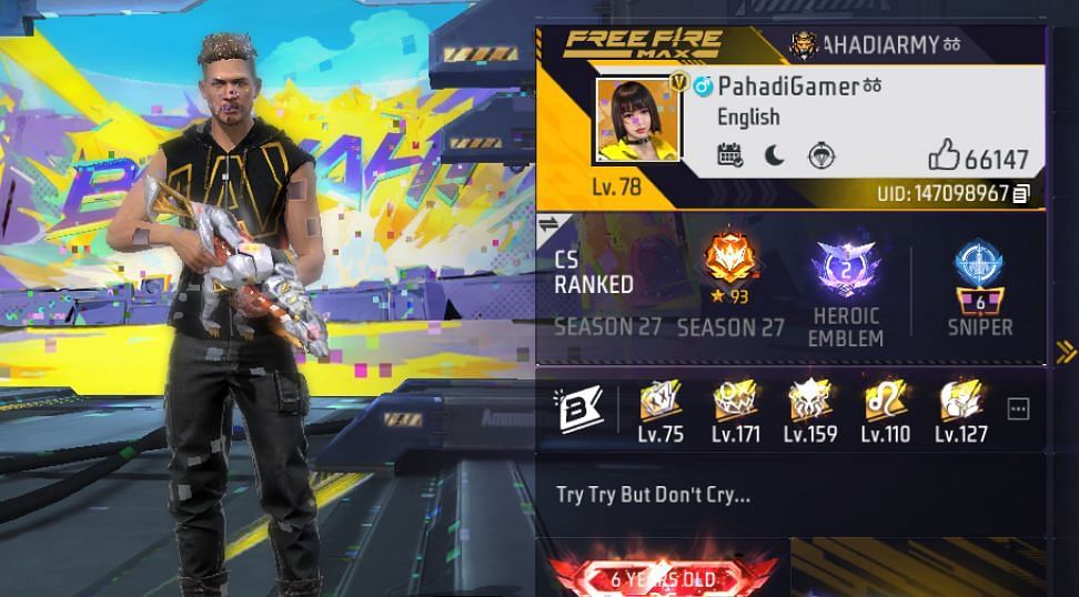 Pahadi Gamer का असली नाम लोकेश कारकोटी है और उनकी Free Fire MAX ID 147098967 है। वो इस समय 78 लेवल पर हैं।