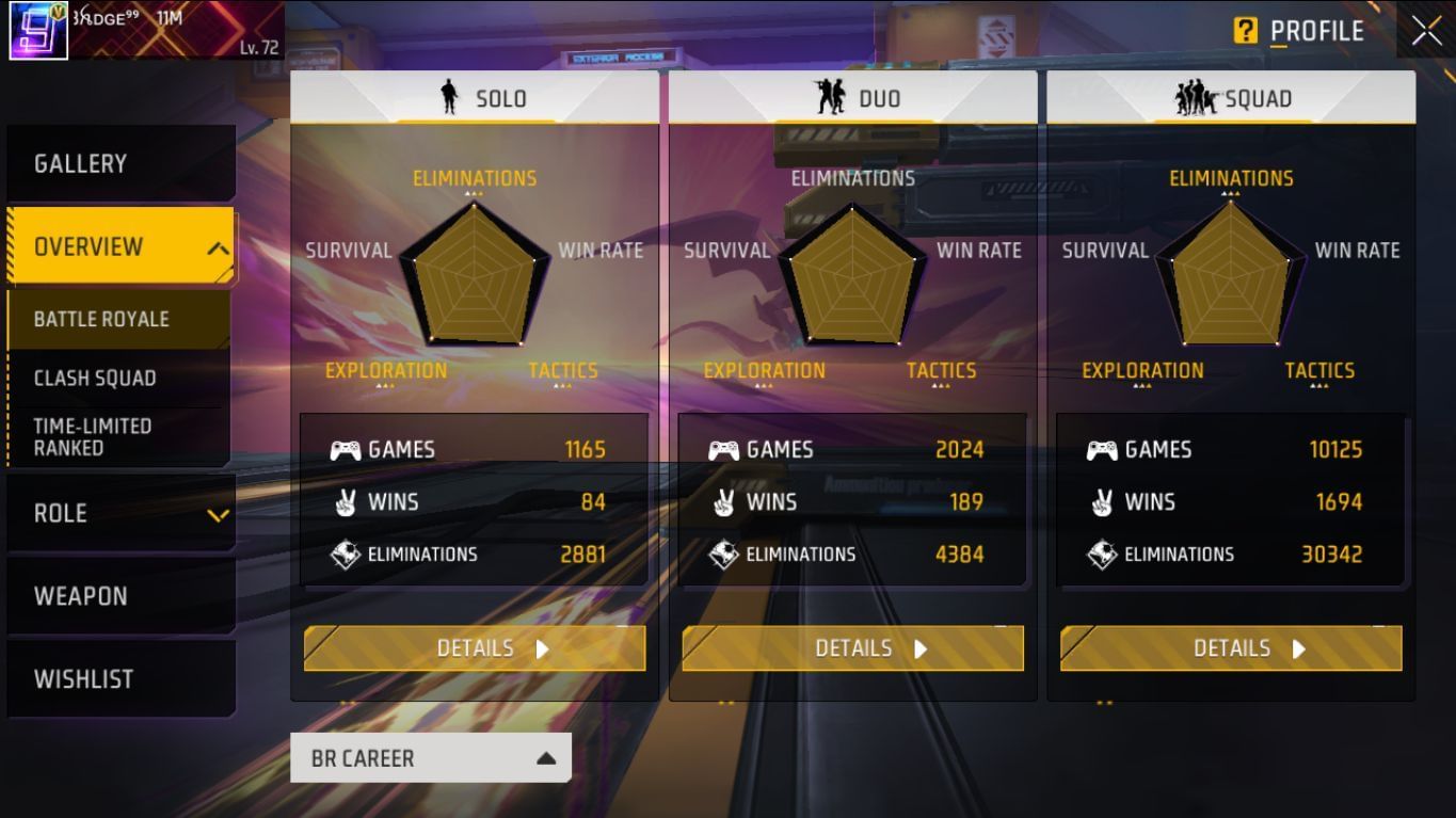 Badge 99 ने 10125 स्क्वाड मैचों में से 1694 में जीत दर्ज की है। वो यहां 30342 किल कर चुके हैं और उनका K/D रेश्यो 3.60 का है। उन्होंने 2024 डुओ मैचों में से 189 में जीत हासिल की हुई है। वो 4384 किल कर चुके हैं और उनका K/D रेश्यो 2.37 का है। सोलो मोड में Badge 99 ने 1165 मैचों में हिस्सा लेते हुए 84 जीत दर्ज की है। वो 2881 किल निकालते हुए 2.67 K/D रेश्यो मेंटेन करने में सफल हुए हैं।