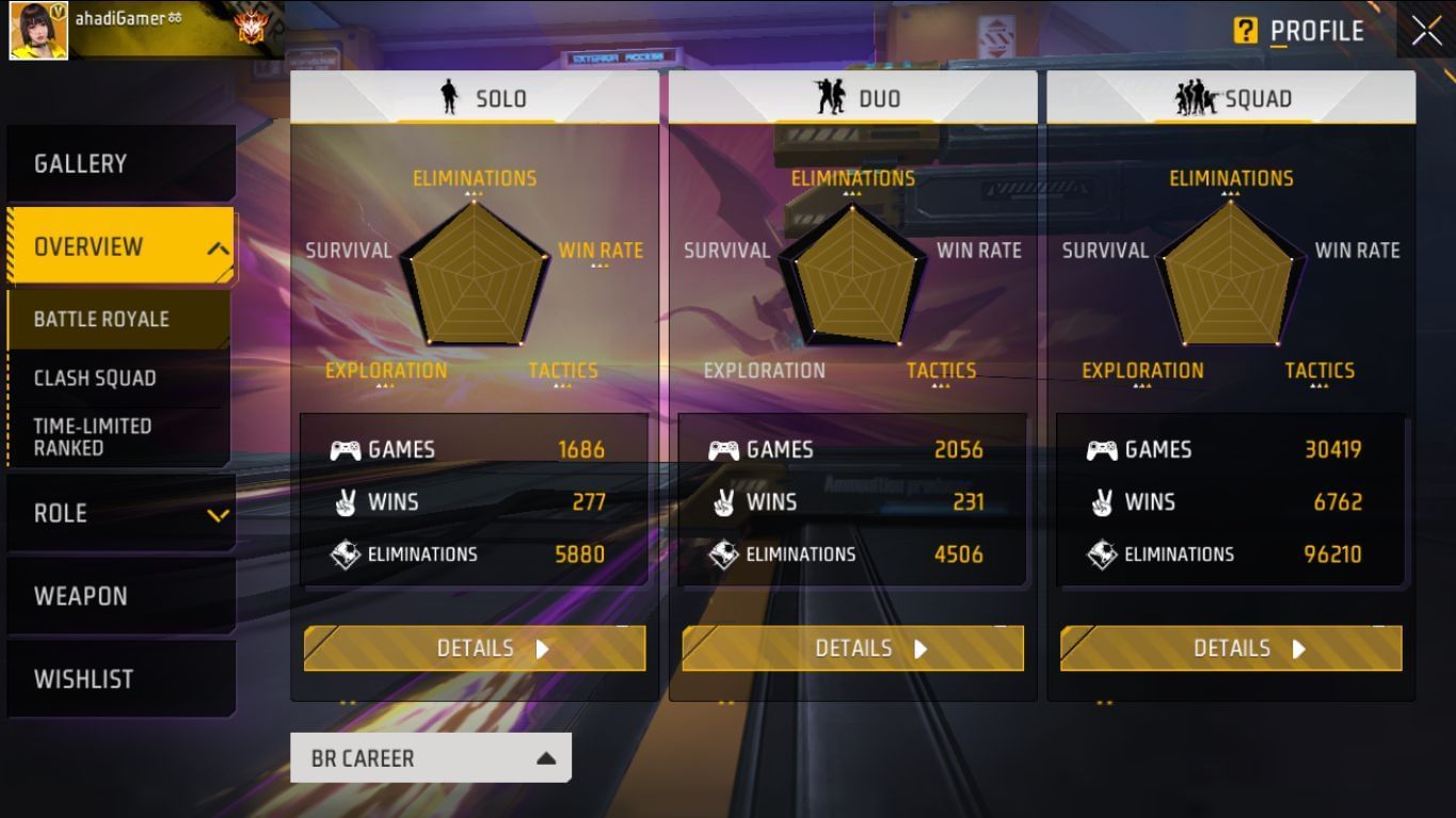 Pahadi ने स्क्वाड मोड में 30419 मैचों में हिस्सा लिया है और उन्हें 6762 में जीत मिली है। वो 96210 किल कर चुके हैं और उनका K/D रेश्यो 4.07 का है। डुओ मोड में 2056 मैचों में हिस्सा लेते हुए उन्होंने 231 में जीत दर्ज की है। वो 4506 किल कर चुके हैं और उनका K/D रेश्यो 2.47 का है। Pahadi ने सोलो मोड में 1686 मैच खेले हैं और इसमें से उन्हें 277 में जीत मिली है। वो 5880 एलिमिनेशन कर चुके हैं और उनका K/D रेश्यो 4.17 का है।