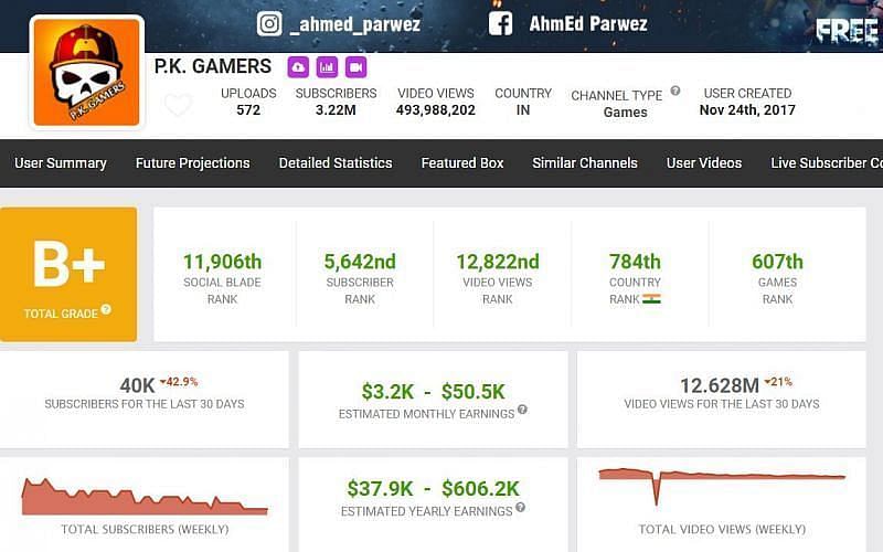 सोशल ब्लेड के अनुसार PK GAMERS की यूट्यूब से महीने की कमाई $3.2K से 50.5K है, साथ ही उनकी साल भर की कमाई $37.9 से $606.2K है।