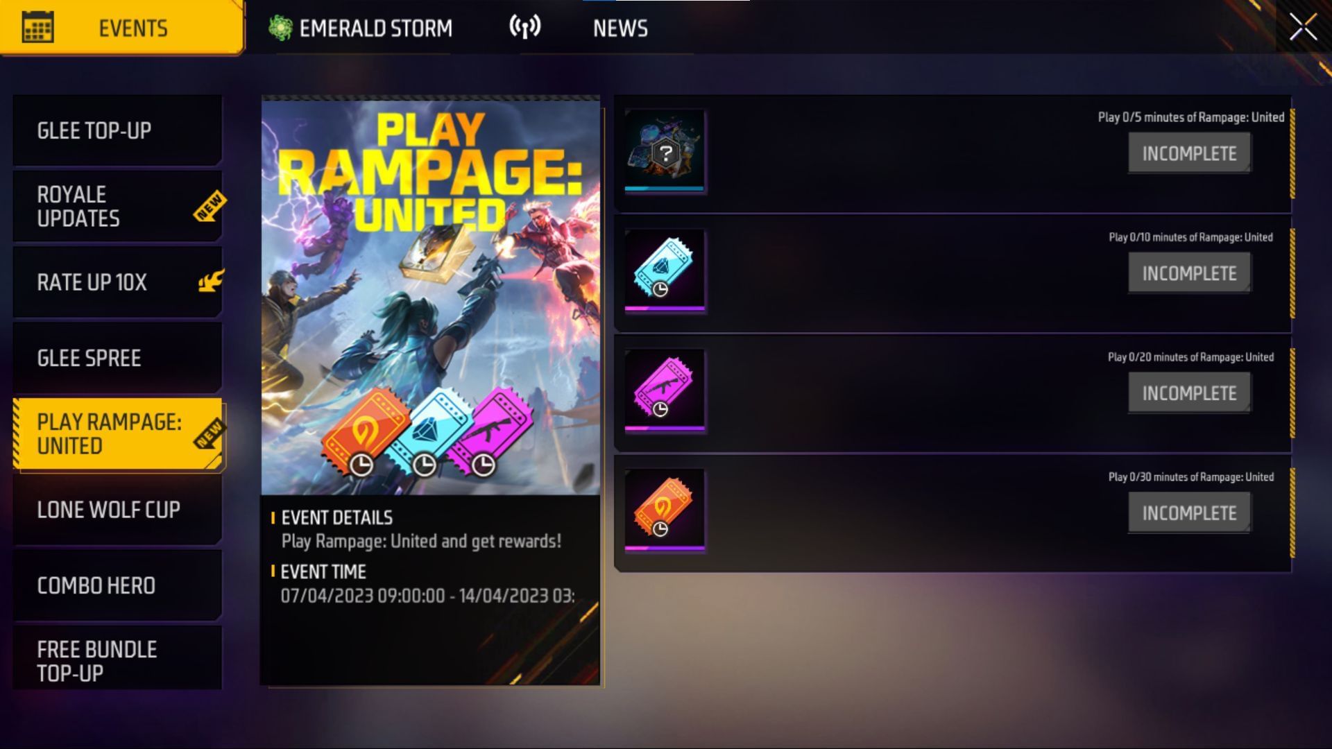 Free Fire Max में Play Rampage United इवेंट 7 अप्रैल 2023 को जोड़ा गया था। जबकि वो 13 अप्रैल 2023 तक रनिंग पर रहने वाला है। गेमर्स को आसान टास्क और मिशन को पूरा करना होगा। उसके बाद में डायमंड्स रॉयल वाउचर्स, वेपन रॉयल वाउचर्स और इनक्यूबेटर वाउचर्स प्राप्त कर सकते हैं।