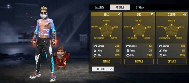 2168 सोलो गेम्स में उन्हें 536 में विजय मिली है। साथ ही वो 8875 किल्स करने में सफल रहे हैं और उनका K/D रेश्यो 5.44 का है।