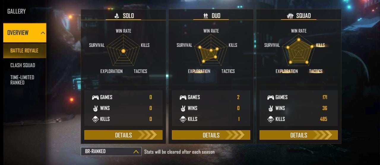 PVS Gaming ने फ्री फायर रैंक मोड के अंदर 171 स्क्वाड मैच खेले हैं और उन्होंने 36 में जीत हासिल की है। उन्होंने 485 किल्स किये हैं और उनका K/D रेश्यो 3.59 का है। इसके साथ ही उन्होंने डुओ मोड में 2 मैच खेलकर 1 किल्स किया है और उनका K/D रेश्यो 0.50 का है। इस खिलाड़ी के सोलो स्टैट्स शून्य है।