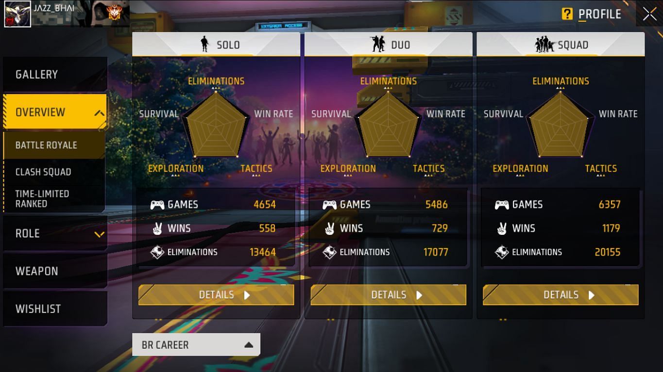 Jazz Gaming ने स्क्वाड मोड में 6357 मैच खेले हैं और इसमें से उन्हें 1179 जीत मिली है। वो 20155 किल कर चुके हैं और उनका K/D रेश्यो 3.89 था। उन्होंने 5486 डुओ मैच खेलकर 729 जीत हासिल की है। वो 17077 एलिमिनेशन कर चुके हैं और उनका K/D रेश्यो 3.59 का है। सोलो मोड में वो 4654 मैच खेले हैं और उन्हें 558 जीत प्राप्त की है। वो 13464 किल कर चुके हैं और उनका K/D रेश्यो 3.29 का है।