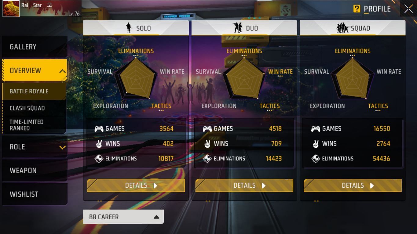 Raistar ने अभी तक सोलो मोड में 3564 मैच खेले हैं और इसमें से उन्हें 402 में जीत मिली है। वो 10817 किल्स कर चुके हैं और उनका K/D रेश्यो 3.42 का है। उन्होंने 4518 डुओ मैचों में से 709 में जीत दर्ज की है। वो 14423 एलिमिनेशन करने में सफल हुए हैं और उनका K/D 3.79 का है। Raistar ने 16550 मैचों में हिस्सा लेते हुए 2764 जीत हासिल की है। वो 54436 किल्स कर चुके हैं और उनका K/D 3.95 का है।