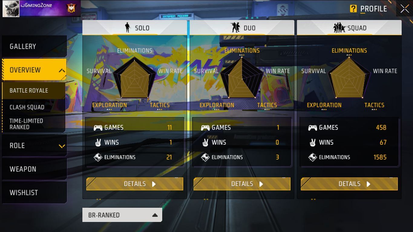 Raj Gaming Zone ने मौजूदा रैंक सीजन में 458 स्क्वाड मैच खेले हैं और 67 जीते हैं। वो 1585 किल कर चुके हैं और उनका K/D रेश्यो 4.05 का है। वो एक डुओ मैच खेले हैं और बिना जीत प्राप्त किए 3 किल कर चुके हैं। उनका K/D रेश्यो 3 का है। Raj Gaming Zone ने 11 सोलो मैच खेले हैं और वो 1 जीत प्राप्त कर चुके हैं। वो 21 एलिमिनेशन कर चुके हैं और उनका K/D रेश्यो 2.10 का है।