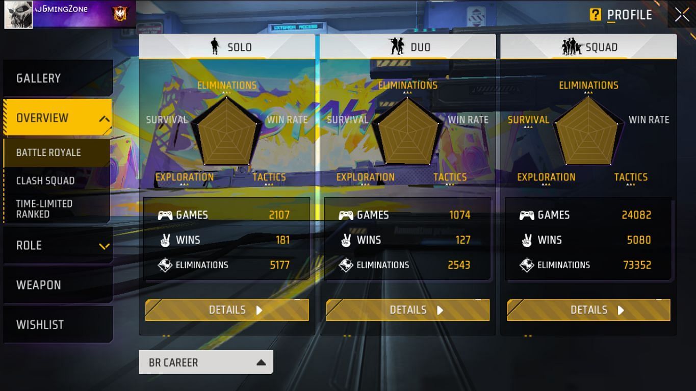 Raj Gaming Zone ने 24082 स्क्वाड मैचों में से 5080 जीत प्राप्त कर चुके हैं। वो 73352 एलिमिनेशन कर चुके हैं और उनका K/D रेश्यो 3.86 का है। वो डुओ मोड में 1074 मुकाबले खेले हैं और वो 127 जीत प्राप्त कर चुके हैं। वो 2543 किल कर चुके हैं और उनका K/D रेश्यो 2.69 का है। Raj Gaming Zone ने 2107 सोलो मैच खेले हैं और उन्होंने 181 जीते हैं। वो 5177 एलिमिनेशन कर चुके हैं और उनका K/D रेश्यो 2.69 का है।