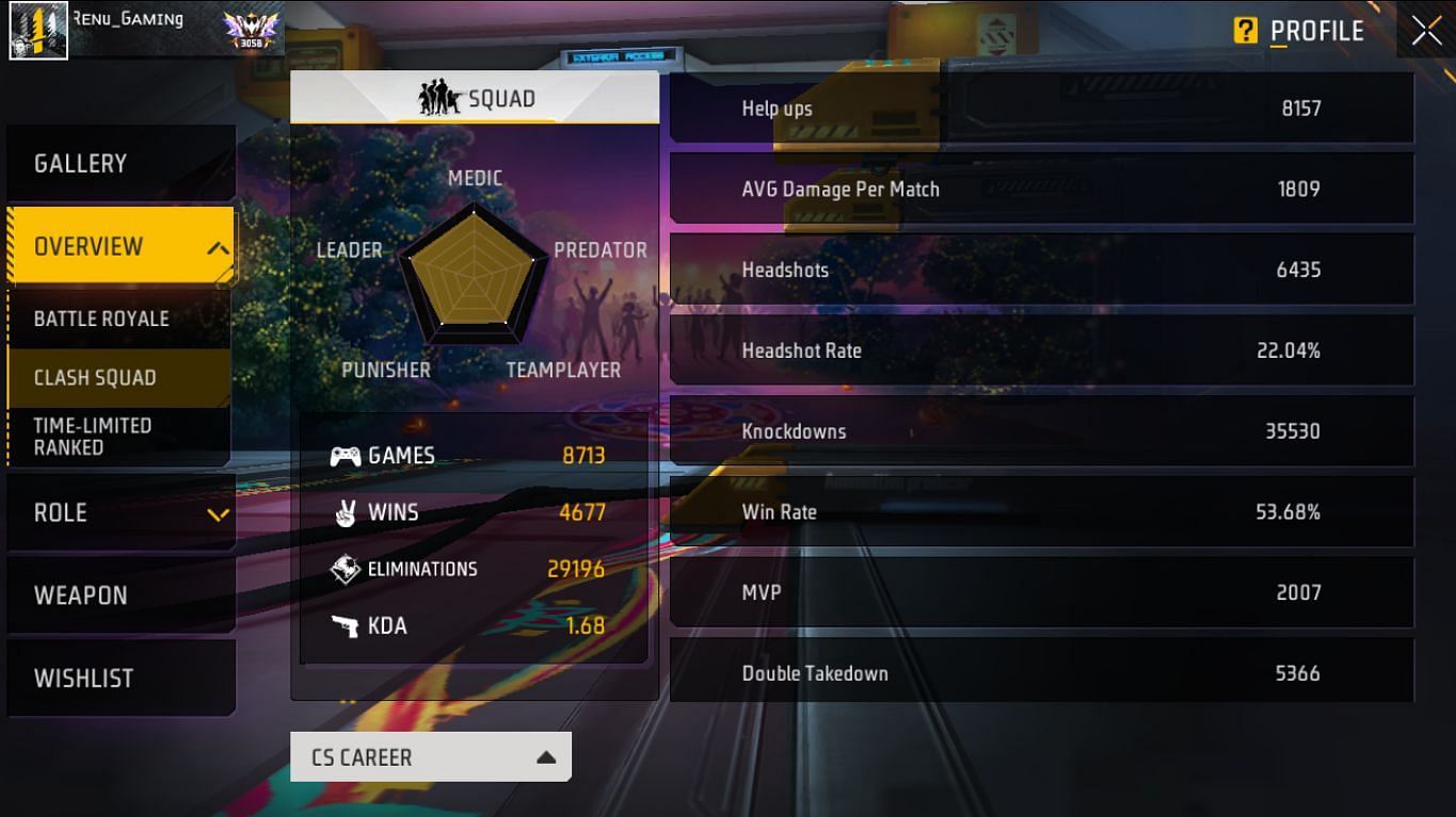 Renu Gaming ने 8713 क्लैश स्क्वाड मैच अब तक खेले हैं और उन्हें 4677 में जीत मिली है। इसी बीच वो 29196 किल करने में सफल हुए हैं और उनका KDA रेश्यो 1.68 का है। वो 2007 मैचों में MVP रहे हैं और उनका जीत प्रतिशत 53.68% का है।