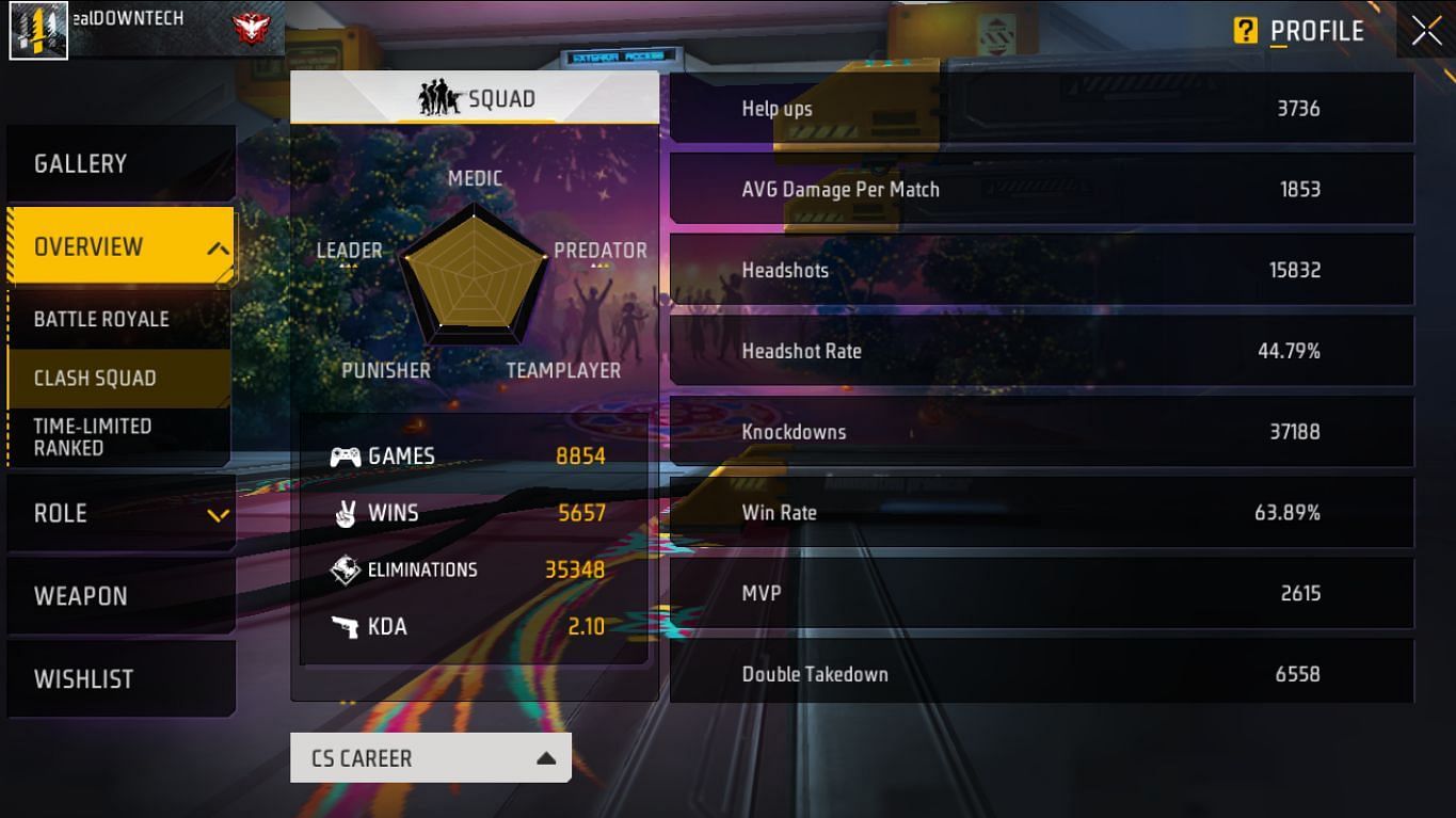 Downtech Gamer ने क्लैश स्क्वाड में अब तक 8854 मैच खेले हैं और उन्हें 5657 में जीत मिली है। वो 35348 किल कर चुके हैं और उनका K/D रेश्यो 2.10 का है। उनका यहां पर जीत प्रतिशत 63.89% का है और वो 2615 मैचों में MVP रहे हैं।
