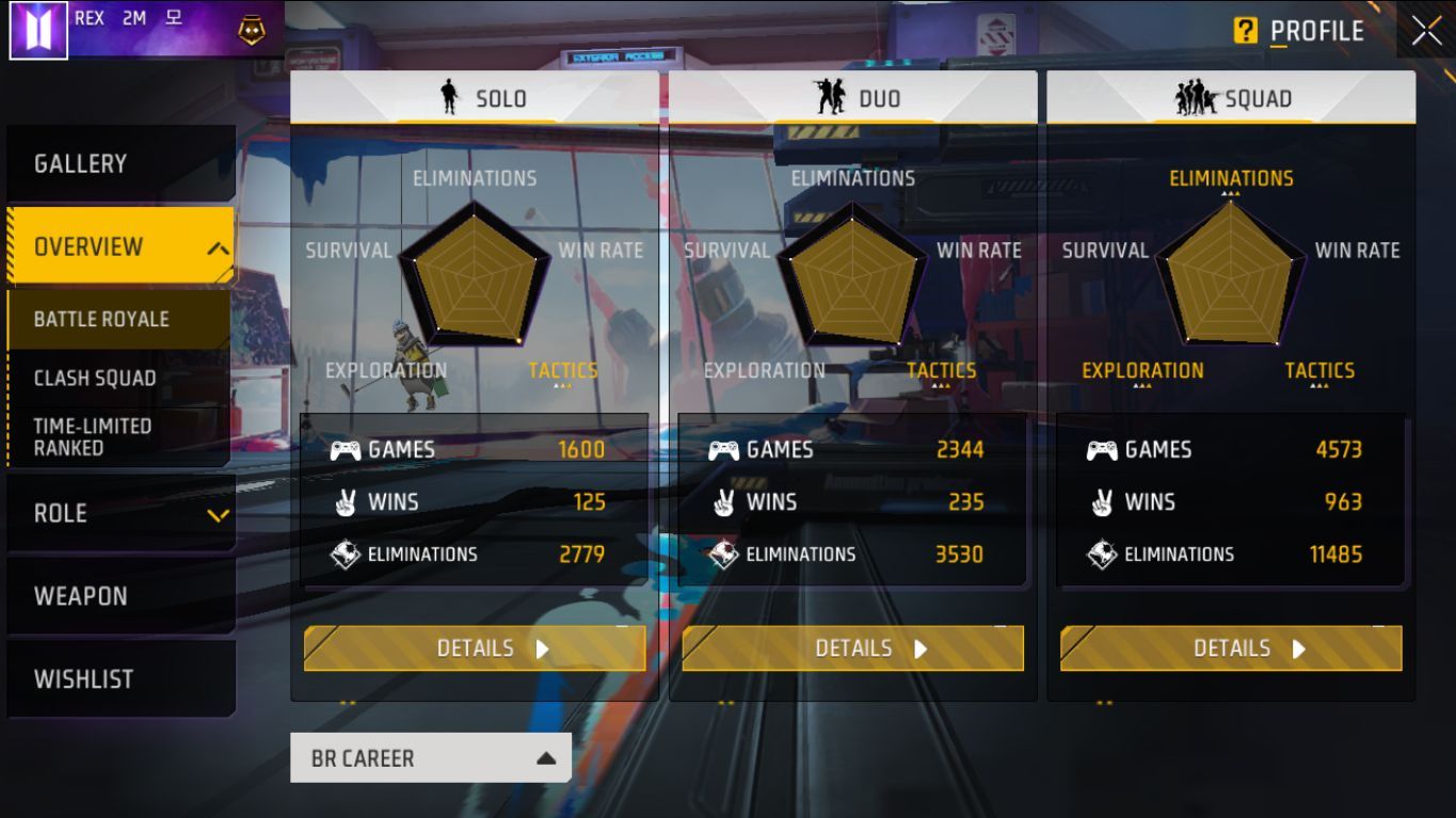 REX ने अब तक स्क्वाड मोड में 4573 मैचों में जगह बनाई है और उन्हें 963 में जीत मिली है। वो 11485 एलिमिनेशन कर चुके हैं और उनका K/D रेश्यो 3.18 का है। उन्होंने 2344 डुओ मैचों में जगह बनाई है और इसमें से उन्हें 235 में जीत मिली है। वो 3530 किल करने में सफल हो चुके हैं और उनका K/D रेश्यो 1.67 का है। REX ने 1600 सोलो मैचों में हिस्सा लिया है और वो 125 जीत चुके हैं। इसी बीच उन्होंने 2779 किल किए हैं और उनका K/D रेश्यो 1.88 का है।