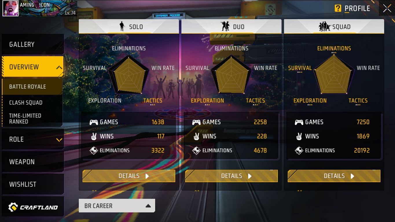 Gaming iCON ने अभी तक स्क्वाड मोड में 7250 मैच खेले हैं और उन्हें 1869 में जीत मिली है। वो 20192 किल करने में सफल हुए हैं और उनका K/D रेश्यो 3.75 का है। डुओ मोड में उन्होंने 2258 मैचों में हिस्सा लेते हुए 228 में जीत प्राप्त की है। वो 4678 एलिमिनेशन करने में सफल हुए हैं और उनका K/D रेश्यो 2.30 का है। 1638 सोलो मैच खेलते हुए उन्हें 117 में जीत मिली है। वो 3322 किल कर चुके हैं और उनका K/D रेश्यो 2.18 का है।