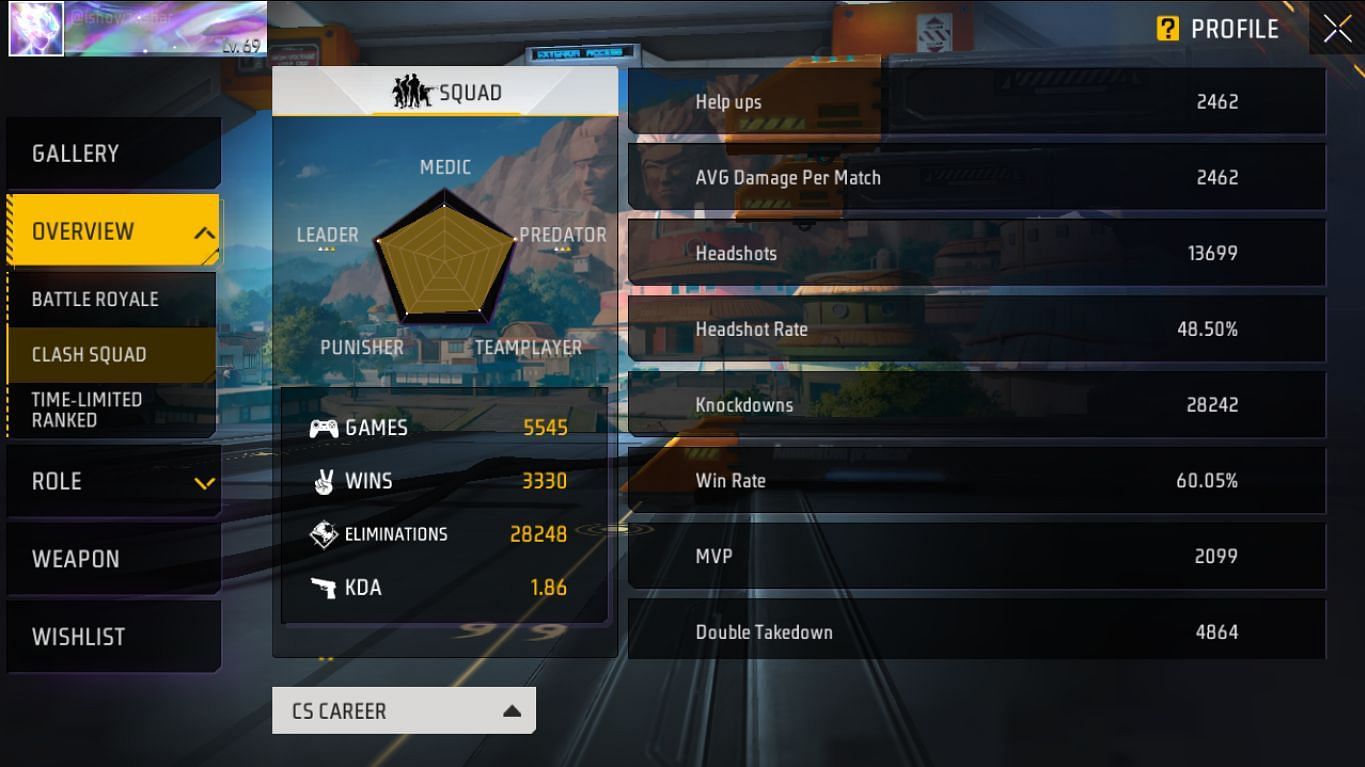 SCS Gamer ने क्लैश स्क्वाड मोड में 5545 मुकाबले खेले हैं और 3330 में उन्होंने जीत हासिल की है। वो 28248 किल करने में सफल हुए हैं और उनका KDA 1.86 है। वो 2099 मुकाबलों में MVP रहे हैं और उनका जीत प्रतिशत 60.05% का है।