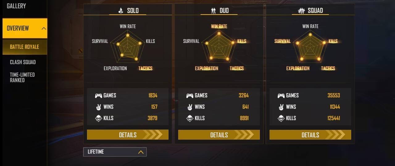 SK Sabir Boss ने फ्री फायर मैक्स में 35553 स्क्वाड मैच खेले हैं और उन्हें 11344 में जीत मिली हैं। इस दौरान उन्होंने 125441 किल्स किये हैं और उनका K/D 5.18 रेश्यो का है। इसके साथ ही उन्होंने डुओ मोड में 3264 मैच खेले हैं और उन्हें 641 में जीत मिली हैं। इसके साथ ही 8991 किल्स कर चुके हैं और उनका K/D 3.43 का है। उन्होंने सोलो मोड में 1834 मैचों में से में 157 जीत दर्ज की हुई है। इसके साथ ही उनका K/D 2.31 रेश्यो का है जबकि वो 3879 किल्स कर चुके हैं।
