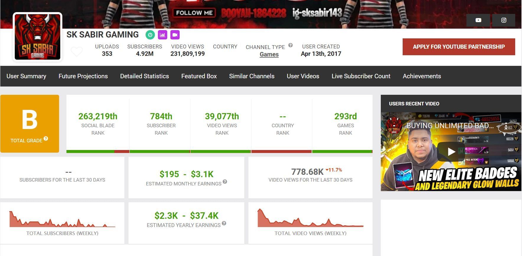 SK Sabir Gaming यूट्यूब से महीने का $195 से $3.1K साथ ही एक वर्ष का लगभग $2.3K से $37.4K कमाते हैं।