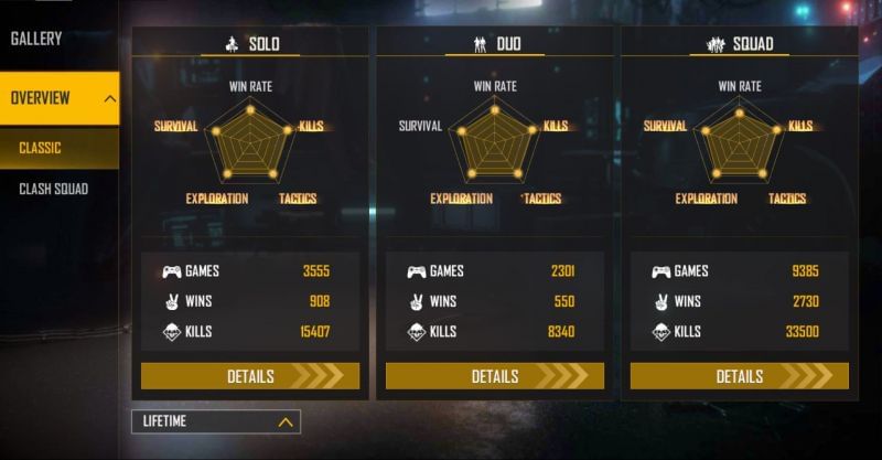 SK Sabir Boss ने 30072 स्क्वाड मैच खेले हैं और उन्होंने 9531 में जीत दर्ज की हैं। साथ ही वो 104727 किल्स कर चुके हैं और उनका K/D रेश्यो 5.10 का हैं। उन्होंने डुओ मोड में 3058 मैच खेले हैं और उन्हें 625 में जीत मिली हैं। इस दौरान वो 8349 किल्स कर चुके हैं और उनका K/D रेश्यो 3.43 का हैं। SK Sabir Boss ने 1646 सोलो मैचों में से 142 में जीत दर्ज की हैं। उन्होंने 3349 किल्स किये हैं और उनका K/D रेश्यो 2.23 का हैं।