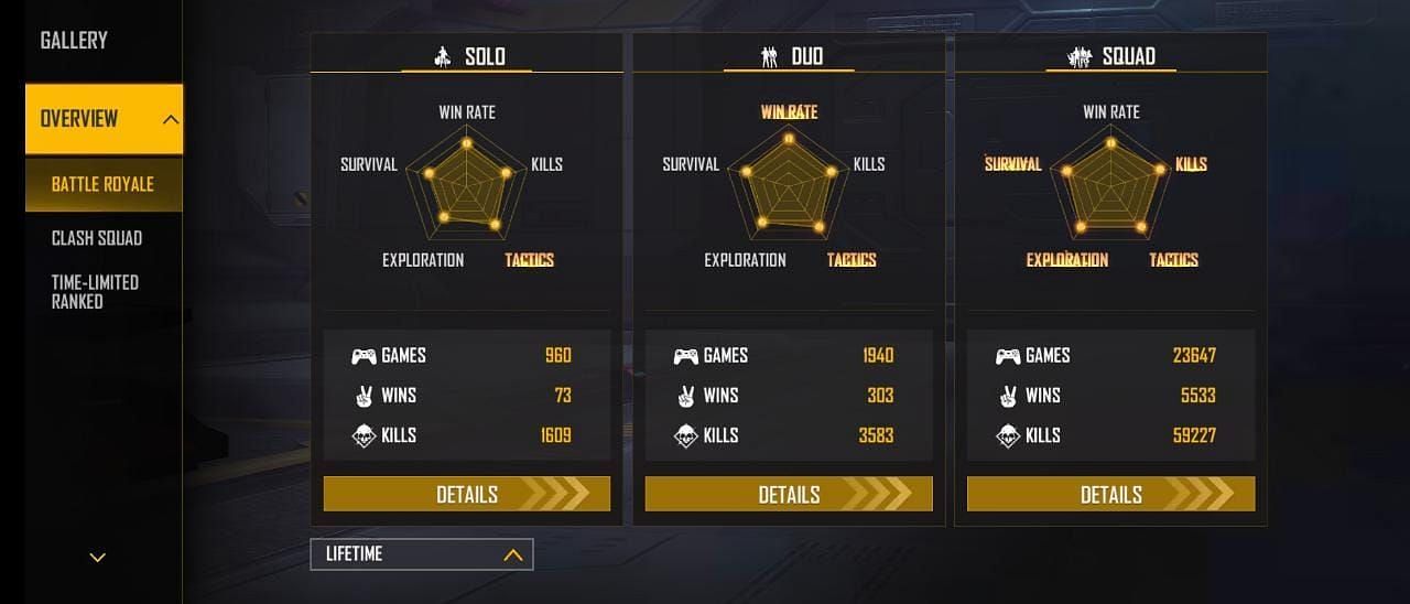 Sooneeta ने गरेना फ्री फायर मैक्स में 23647 स्क्वाड मैच खेले हैं और उन्हें 5533 में जीत मिली हैं। इस दौरान उन्होंने 59227 किल्स किये हैं और उनका K/D 3.27 रेश्यो का है। इसके साथ ही उन्होंने डुओ मोड में 1940 मैच खेले हैं और उन्हें 303 में जीत मिली हैं। इसके साथ ही 3583 किल्स कर चुके हैं और उनका K/D 2.19 का है। उन्होंने सोलो मोड में 960 मैचों में से 73 जीत दर्ज की हुई है। इसके साथ ही उनका K/D 1.81 रेश्यो का है जबकि वो 1609 किल्स कर चुके हैं।