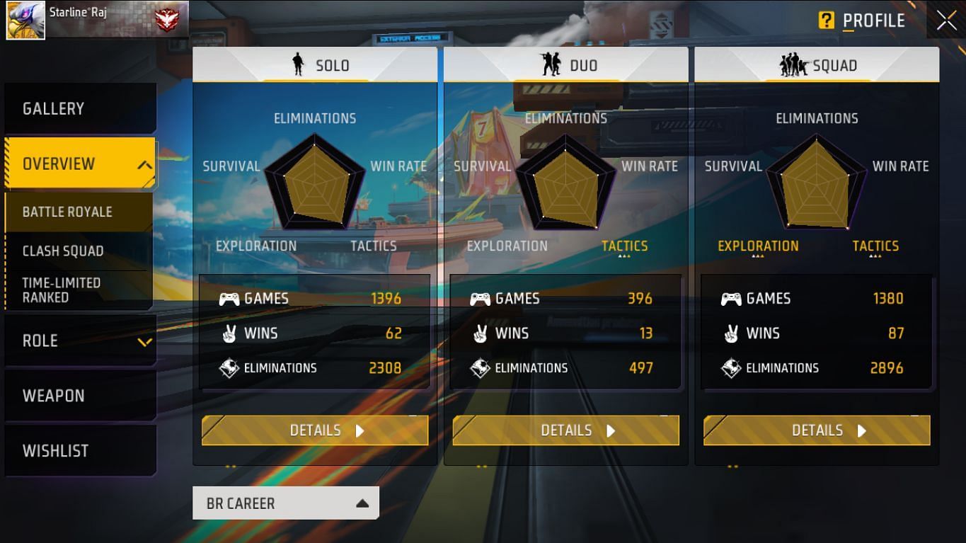 Starline Raj स्क्वाड मोड में 1380 मैच खेलते हुए 87 में जीत दर्ज कर चुके हैं। वो 2896 किल कर चुके हैं और उनका K/D रेश्यो 2.24 का है। डुओ मोड में 396 मैच खेले हैं और उन्हें 13 में जीत मिली है। वो 497 किल कर चुके हैं और उनका K/D रेश्यो 1.30 का है। Raj ने 1396 सोलो मैच खेले हैं और उन्हें 62 में जीत मिली है। वो 2308 एलिमिनेशन कर चुके हैं और उनका K/D रेश्यो 1.73 का है।