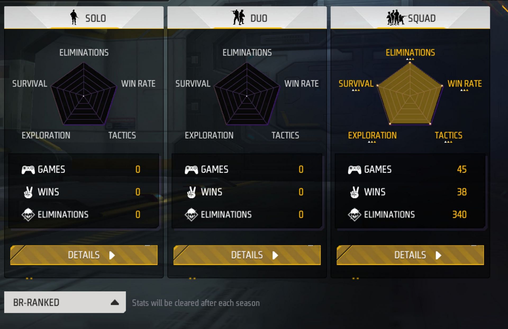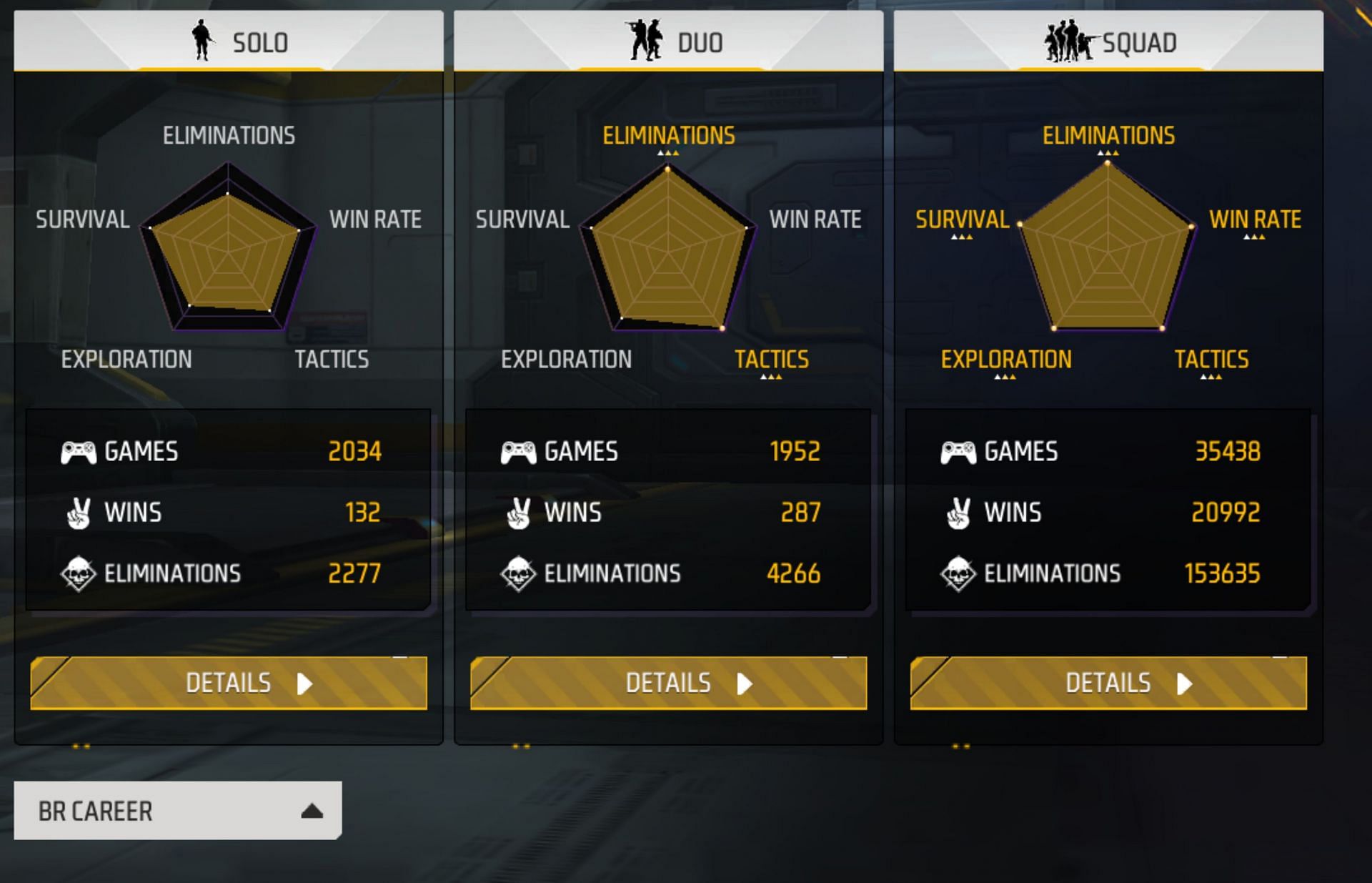 TEB Gaming ने फ्री फायर मैक्स में 35438 स्क्वाड मैच खेलकर 20992 में जीत हासिल की है। उन्होंने 153635 किल्स किये हैं और उनका K/D रेश्यो 10.64 का है। इस खिलाड़ी ने डुओ मोड में 1952 मैच खेले हैं इस दौरान उन्होंने 287 में जीत हासिल की है। उन्होंने 4266 किल्स किये हैं और उनका K/D रेश्यो 2.56 का है। उन्होंने सोलो मोड में 2034 मैच खेलकर 132 में जीत हासिल की है। इसके अलावा 2277 किल्स किये हैं और उनका K/D रेश्यो 1.20 का है।