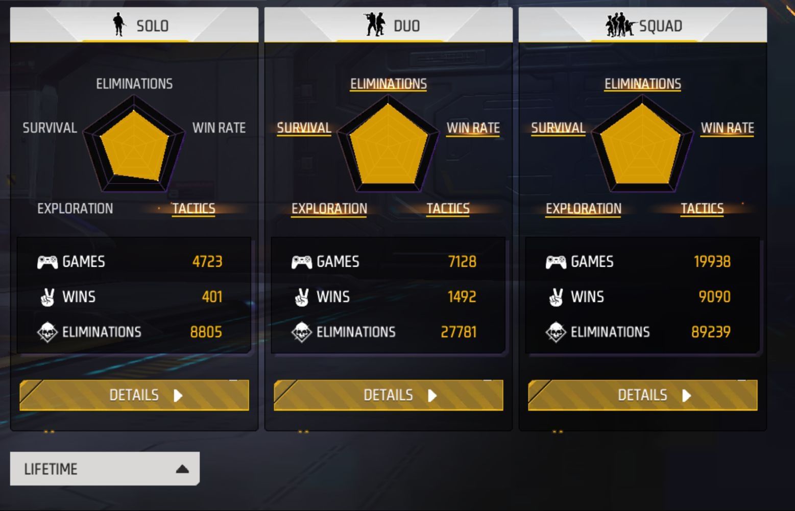 Tonde Gamer ने फ्री फायर मैक्स में 19938 स्क्वाड मैच खेले हैं और उन्हें 9090 में जीत मिली हैं। इस दौरान उन्होंने 89239 किल्स किये हैं और उनका K/D रेश्यो 2.04 का है। इसके साथ ही उन्होंने डुओ मोड में 7128 मैच खेले हैं और उन्हें 1492 में जीत मिली हैं। इसके साथ ही 427781 किल्स कर चुके हैं और उनका K/D रेश्यो 4.93 का है। उन्होंने सोलो मोड में 4723 मैचों में से 401 जीत दर्ज की हुई है। इसके साथ ही उनका K/D रेश्यो 8.23 का है जबकि वो 8805 किल्स कर चुके हैं।