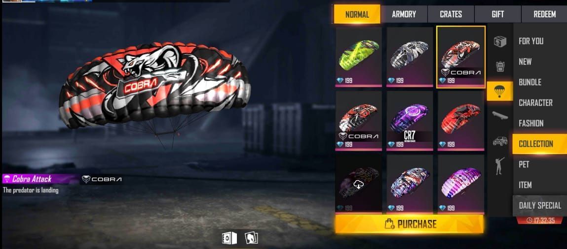 Free Fire में पैराशूट की मदद से प्रत्येक गेमर्स मैदान पर लैंड करता है। इस समय कलेक्शन में Cobra की खतरनाक स्किन मौजूद है। इस स्किन को प्लेयर्स कुल 199 डायमंड्स में प्राप्त कर सकते हैं।