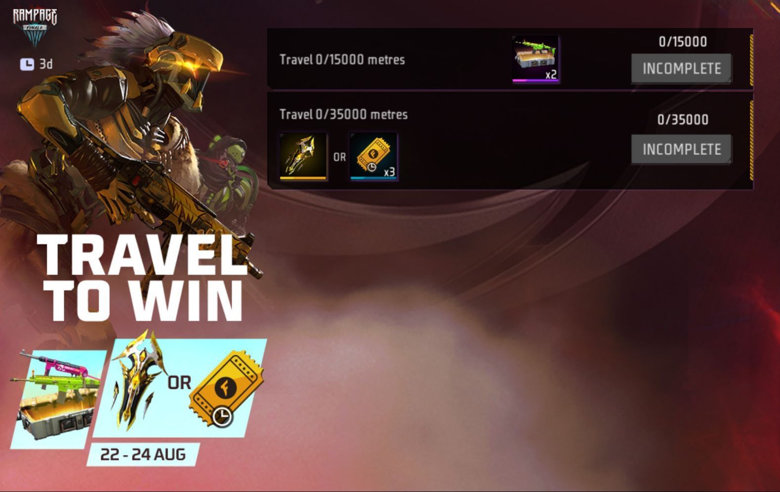 Free Fire MAX में भारतीय सर्वर पर Travel for Rewards इवेंट को 22 अगस्त 2023 को जोड़ा गया था। यह इवेंट 24 अगस्त 2023 तक चलेगा। गेमर्स मिशन्स को पूरे करके मुफ्त में रिवॉर्ड्स प्राप्त कर सकते हैं।