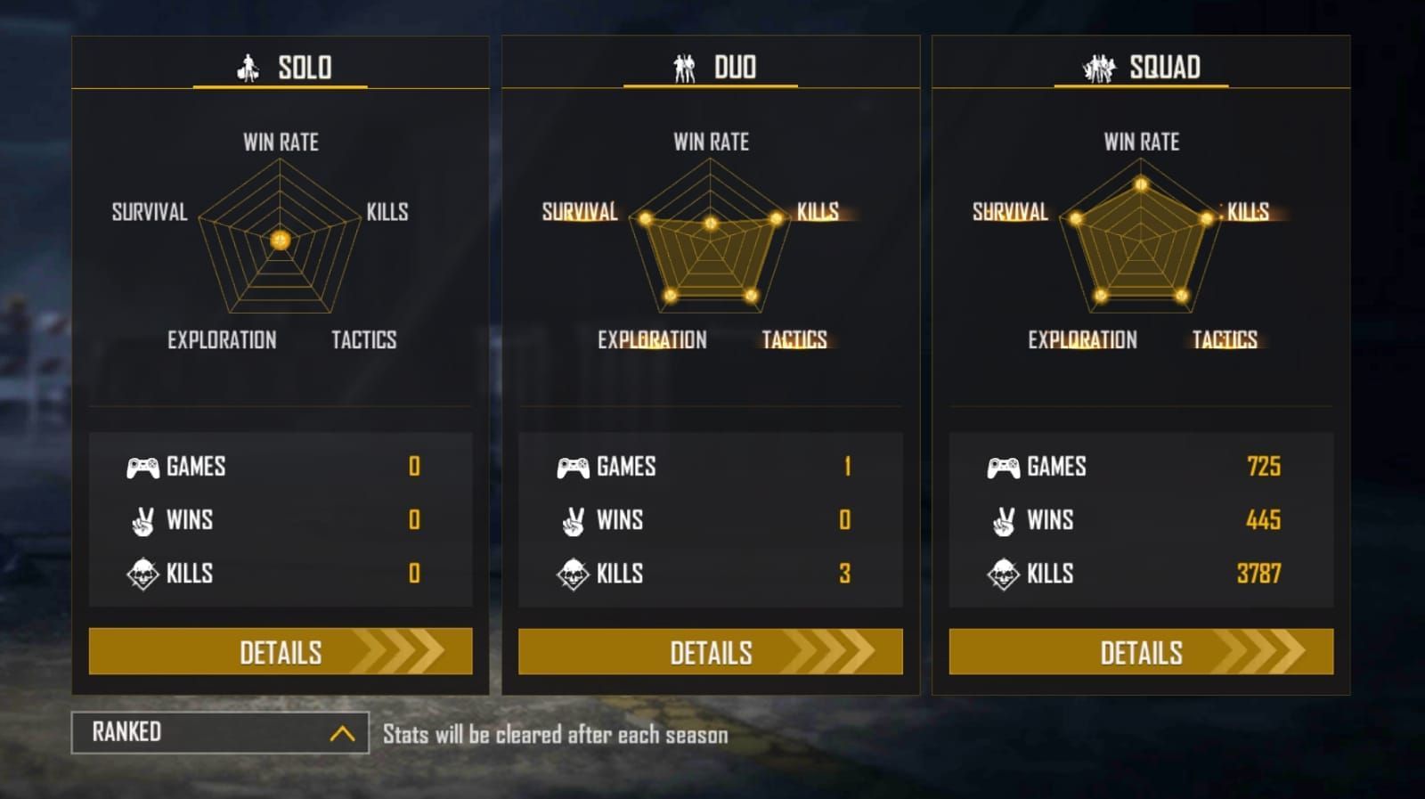 UnGraduate Gamer ने Free Fire रैंक मोड में 725 स्क्वाड मैच खेलकर 445 में जीत हासिल की है। उन्होंने 3787 किल्स किये हैं और उनका K/D रेश्यो 13.55 का है। इस खिलाड़ी ने डुओ मोड में 1मैच खेलकर 3 किल्स किये हैं और उनका K/D रेश्यो 3.00 का है। इस खिलाड़ी के सोलो स्टैट्स शून्य है।