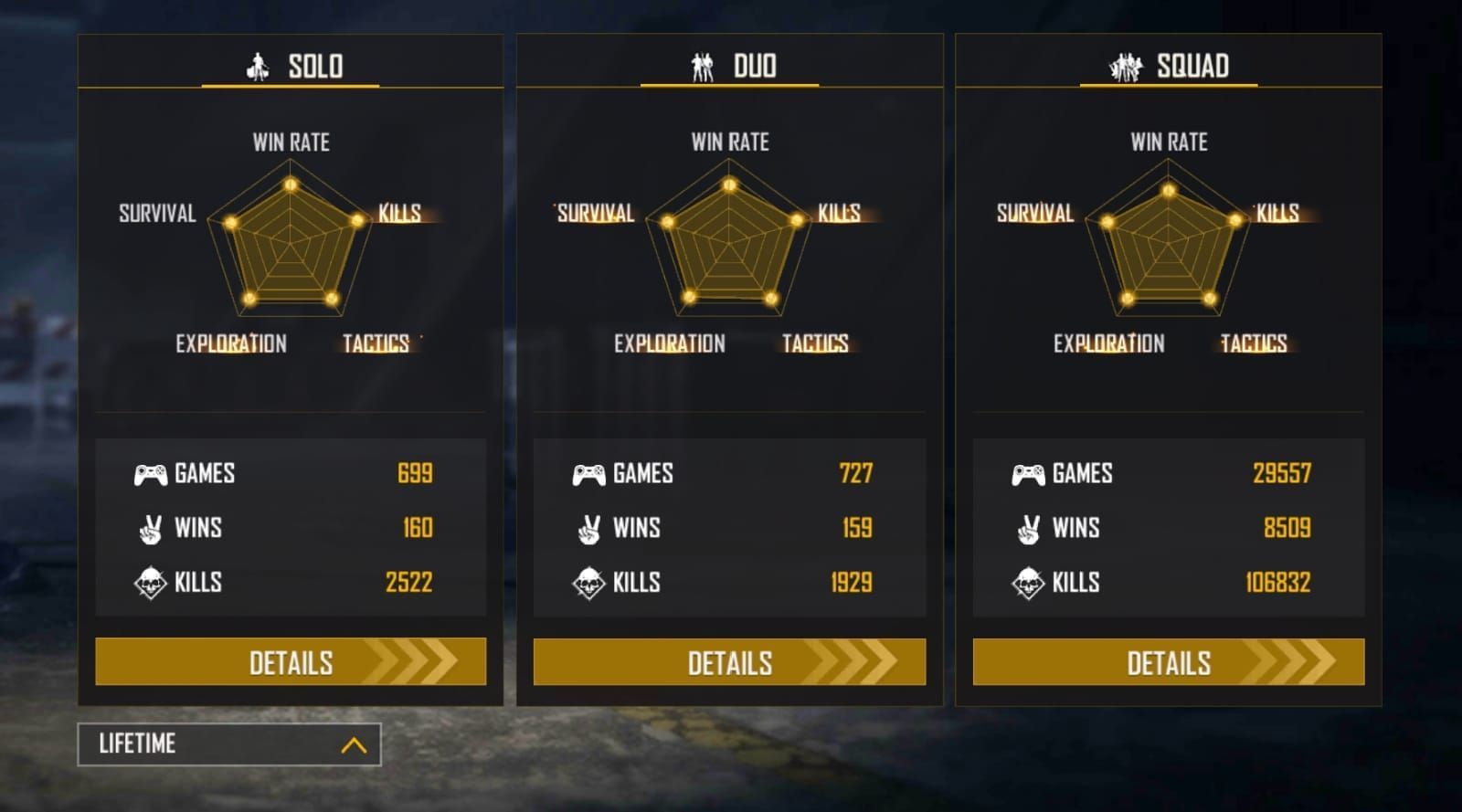 UnGraduate Gamer ने Free Fire में 29557 स्क्वाड मैच खेलकर 8509 में जीत हासिल की है। उन्होंने 106832 किल्स किये हैं और उनका K/D रेश्यो 5.08 का है। इस प्लेयर ने डुओ मोड में 727 मैच खेले हैं इस दौरान उन्होंने 159 में जीत हासिल की है। उन्होंने 1929 किल्स किये हैं और उनका K/D रेश्यो 3.40 का है। इस यूट्यूबर ने Free Fire सोलो मोड में 699 मैच खेलकर 160 में जीत हासिल की है। उन्होंने 2522 किल्स किये हैं और उनका K/D रेश्यो 4.68 का है।