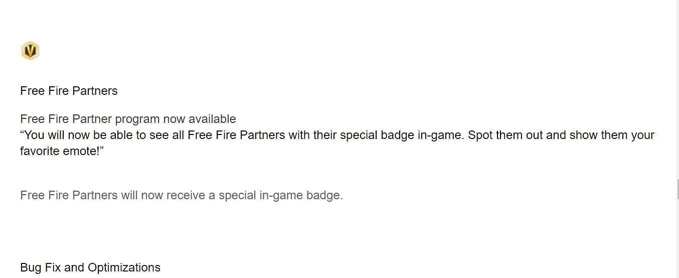 Garena Free Fire के डेवेलपर ने खिलाड़ियों के लिए V Badge इन-गेम पेश किया था। यह बैज प्लेयर्स के लिए OB25 से गेम के अंदर उपलब्ध है। ये सिर्फ भागीदारों के साथ ही इस्तेमाल किया जा सकता है। ये उनकी प्रोफाइल पर प्रदर्शित होता है जो सभी प्लेयर्स के लिए सबसे अलग बनाया है।