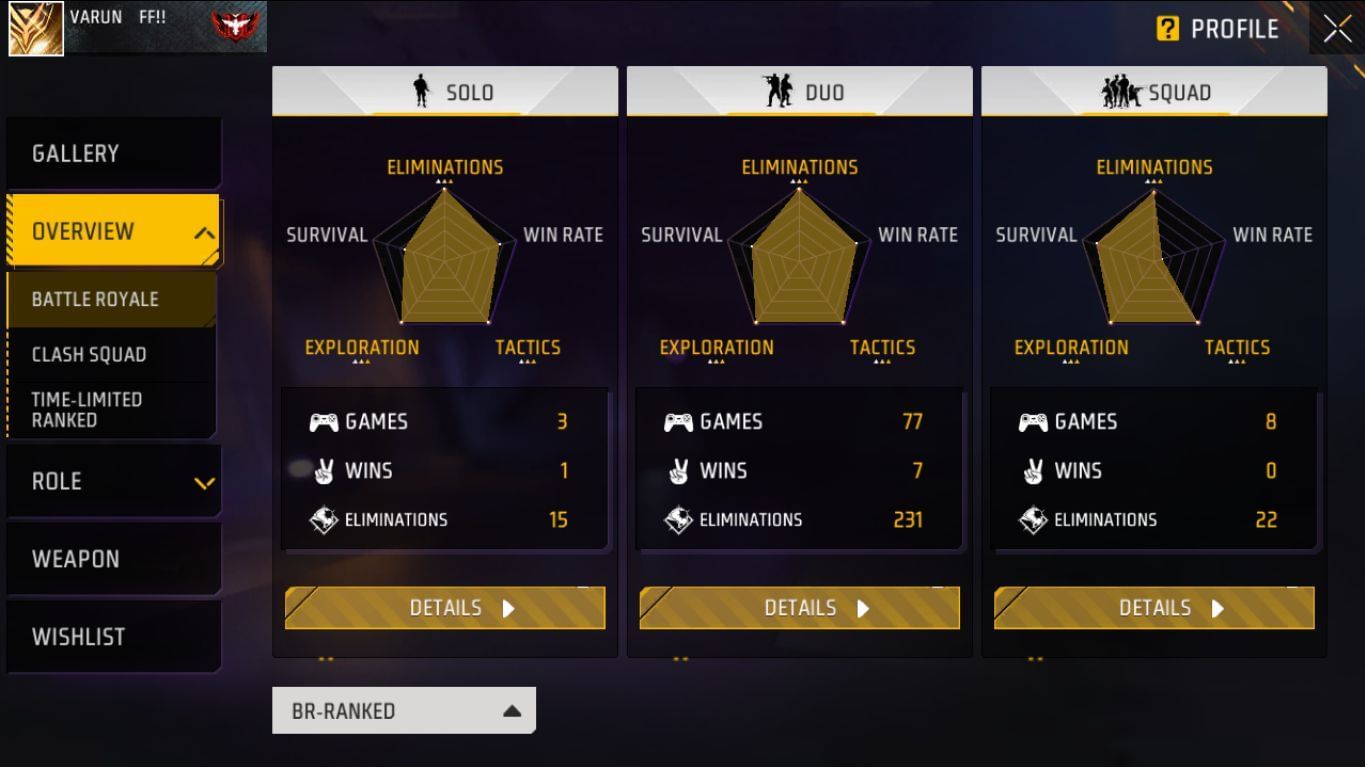 Varun FF ने 1000 स्क्वाड मैच खेले हैं और उन्हें 89 में जीत मिली है। वो 2195 किल चुके हैं और उनका K/D रेश्यो 2.41 है। उन्होंने डुओ मोड में 552 मुकाबले खेले हैं और वो 34 में जीत चुके हैं। वो 1348 किल करने में सफल रहे हैं और उनका K/D रेश्यो 2.60 है। 598 सोलो मैच खेलकर Varun FF 22 में जीत चुके हैं। उन्होंने 1652 किल किए हैं और उनका K/D रेश्यो 2.87 का है।