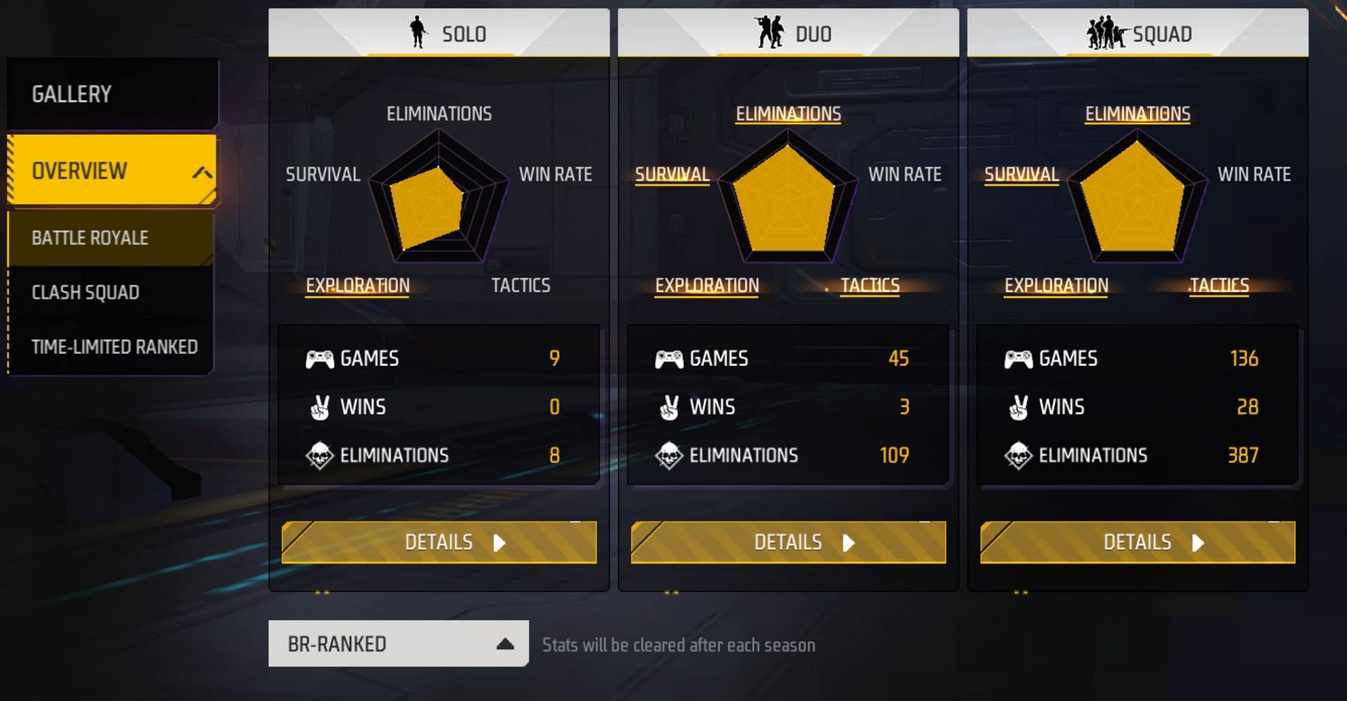 Vipu Gamer ने फ्री फायर मैक्स में क्लैश स्क्वाड रैंक मोड में 136 मैच खेले हैं और उन्हें 28 जीत मिली हैं। इस दौरान उन्होंने 387 किल्स किये हैं और उनका K/D रेश्यो 0.89 का है। इसके साथ ही उन्होंने डुओ मोड में 45 मैच खेले हैं और 3 में जीत हासिल की है। उन्होंने 109 किल्स कर चुके हैं और उनका K/D रेश्यो 2.60 का है। इस खिलाड़ी ने सोलो मोड में 9 मैच खेले हैं और 9 किल्स किये हैं।